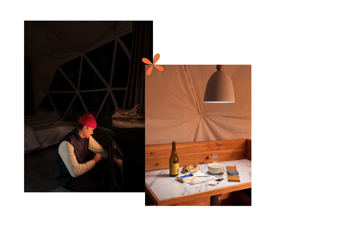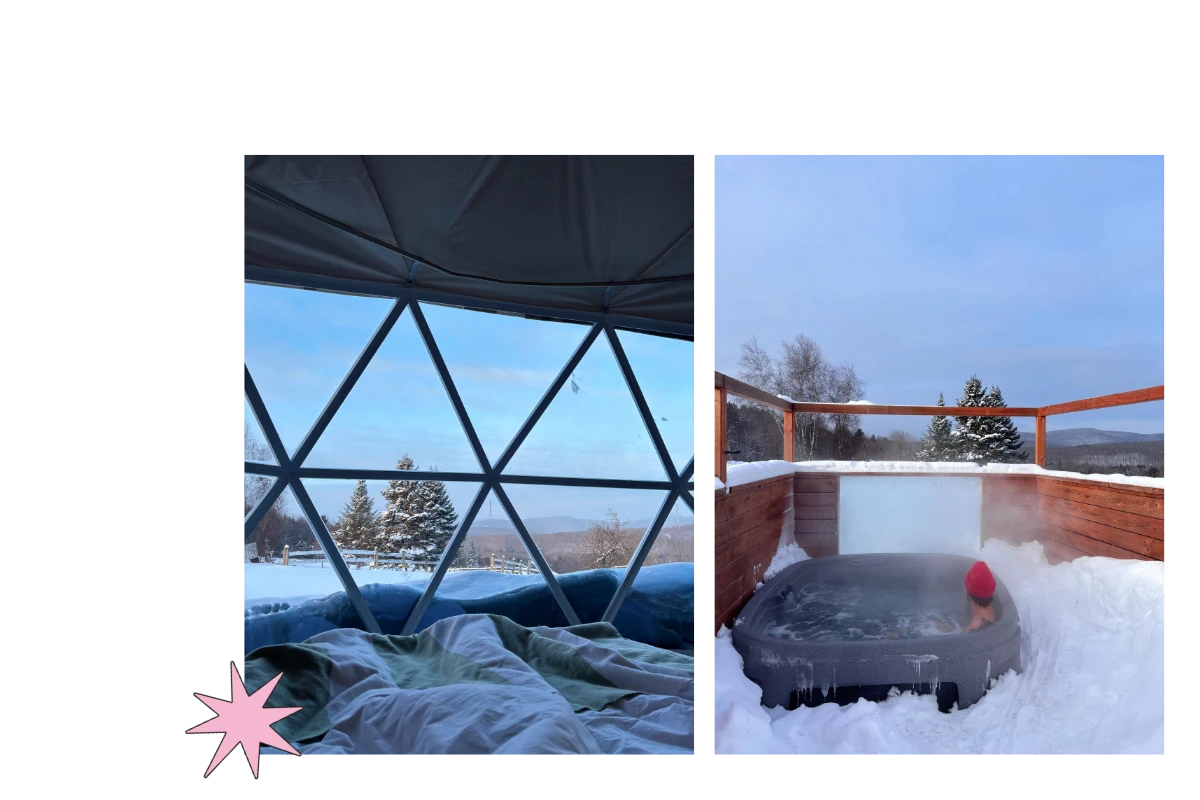 Pour le week-end, on a eu la chance d’essayer les Dômes Mi-Clos, situés à Orford. D’emblée, laissez-moi vous dire qu’ils sont encore plus charmants qu’ils en ont l’air sur le site web. Chaque dôme est entièrement vitré d’un côté, offrant une vue incroyable sur les montagnes avoisinantes, en plus d’avoir son propre sauna, spa, lit king, une cuisine entièrement équipée, une salle de bain et un poêle à bois. C’était le parfait havre de paix où revenir après une longue journée à jouer dehors (et faire une classique partie de crible).