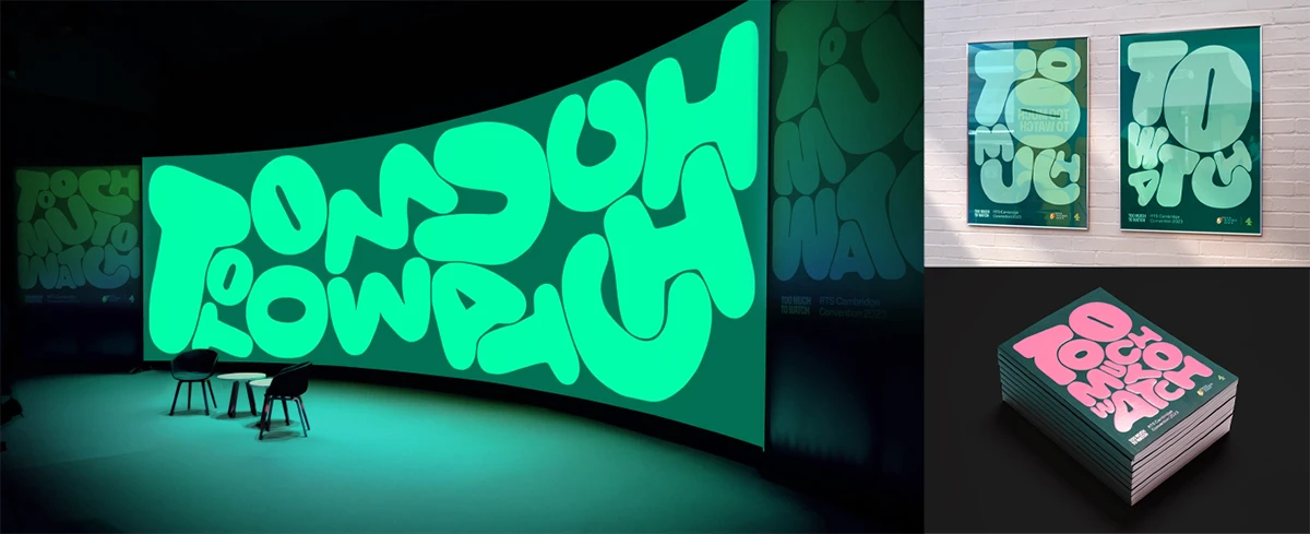 Le logo de Too Much To Watch était facile à manquer, car il s’agit d’une conférence de la Royal Television Society, une organisation caritative et éducative qui promeut l’art et la science de la télévision en Angleterre. Pas de quoi s’exciter, donc? Détrompez-vous, car le Studio Kiln a concocté une imagerie loufoque et mouvante, inspirée par le titre de l’événement : trop de choses à regarder. Les lettres s’entassent, se déforment et cherchent à envahir l’espace dans une avalanche de couleurs vives. Hello, le design mou!