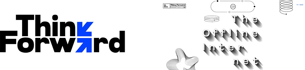 Puisque Think Forward est un groupe de réflexion sur l’avenir social et technologique de notre monde, il est normal que son image de marque questionne, incite et démontre. Dans sa grande sobriété formelle, le logo du rapport 2024 illustre un phénomène assez connu : la capacité de notre cerveau à « autocorriger » un mot dont une lettre aurait été remplacée par un autre signe. Si vous voulez briller au réveillon, précisez qu’il s’agit d’un effet marginal de la loi de clôture (ou loi de fermeture) de la théorie de la Gestalt. Ici, deux flèches remplacent un K et un A sans affecter la lisibilité des mots. En regardant de plus près, on s’aperçoit que 1) ces flèches ont quand même été dessinées pour ressembler aux lettres manquantes, et que 2) chacune symbolise son mot : vers l’intérieur pour la pensée, vers l’extérieur pour l’avenir. Brillant.