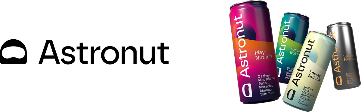 Quel est l’amuse-gueule préféré des voyageurs cosmiques (anglophones)? Les Astronuts! Cette savoureuse blague se double d’un nourrissant concept marketing : des noix mélangées contenues dans des cannettes, COMME DANS L’ESPACE! Le logo n’exploite rien de plus que le concept de base en donnant à la visière du casque la forme d’une arachide. La gamme Astronut ressemble à un assortiment de boissons énergisantes aux dégradés psychédéliques – sauf le Space Fruit Mix, qui reste gris comme un monolithe. Une création intergalactique du studio suédois Jesper Holm.