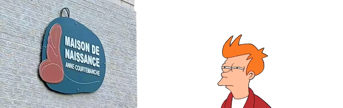 Le logo de la Maison de naissance Anne-Courtemanche, située à Montréal, a fait le tour des internettes au printemps dernier. Ou, plus exactement, une photo de ce logo prise sous un angle qui renforce la ressemblance entre ce qui est dessiné et ce qu’on veut y voir. Apparemment, le « graphiste » qui a engendré cette œuvre essayait de représenter le corps (décapité, ben oui, toi!) d’une femme enceinte assise. Et personne, dans le comité de validation, n’y a vu autre chose. Personne ne s’est donc opposé à ce que la façade de la maison de naissance soit ornée de ce saisissant symbole de fertilité.