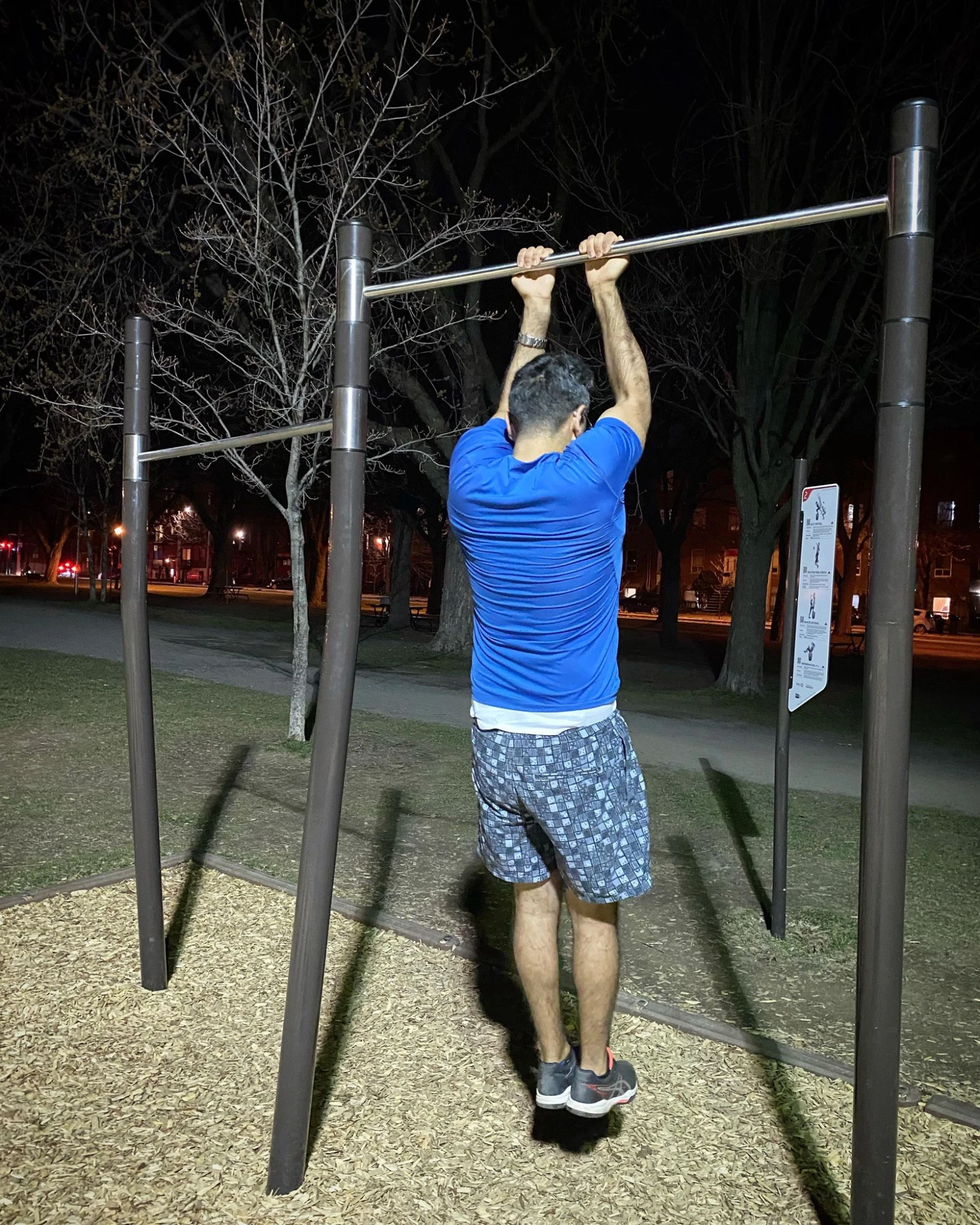 Dans le petit gym urbain un peu plus loin, Marouane regarde sa montre. C’est déjà l’heure de partir, mais d’abord une dernière série de chin up sur la barre latérale. Le jeune homme habite tout près, donc il sera chez lui à temps. « Avec le beau temps qui commence, j’espère qu’ils vont ramener l’heure à 21h30. Mais en attendant, je suis les règles, pas le choix, c’est une crise mondiale », analyse Marouane en reprenant son souffle.