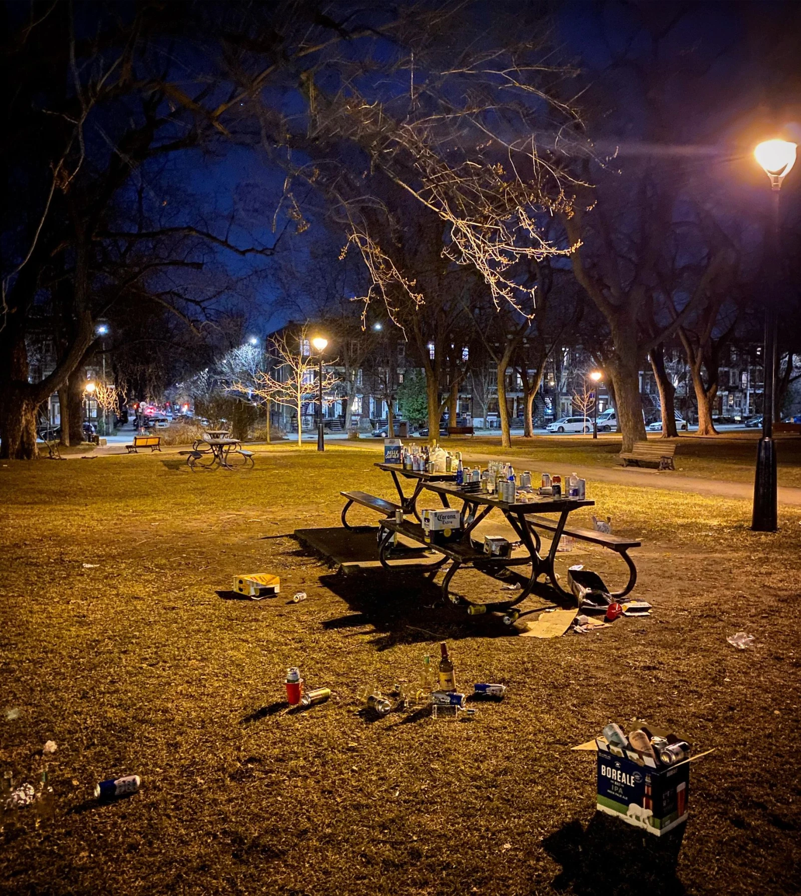 21h30. Le couvre-feu est en vigueur. Les corps morts de bouteilles vides ou de cannettes sont abandonnés autour des poubelles et sur les tables de pique-nique.