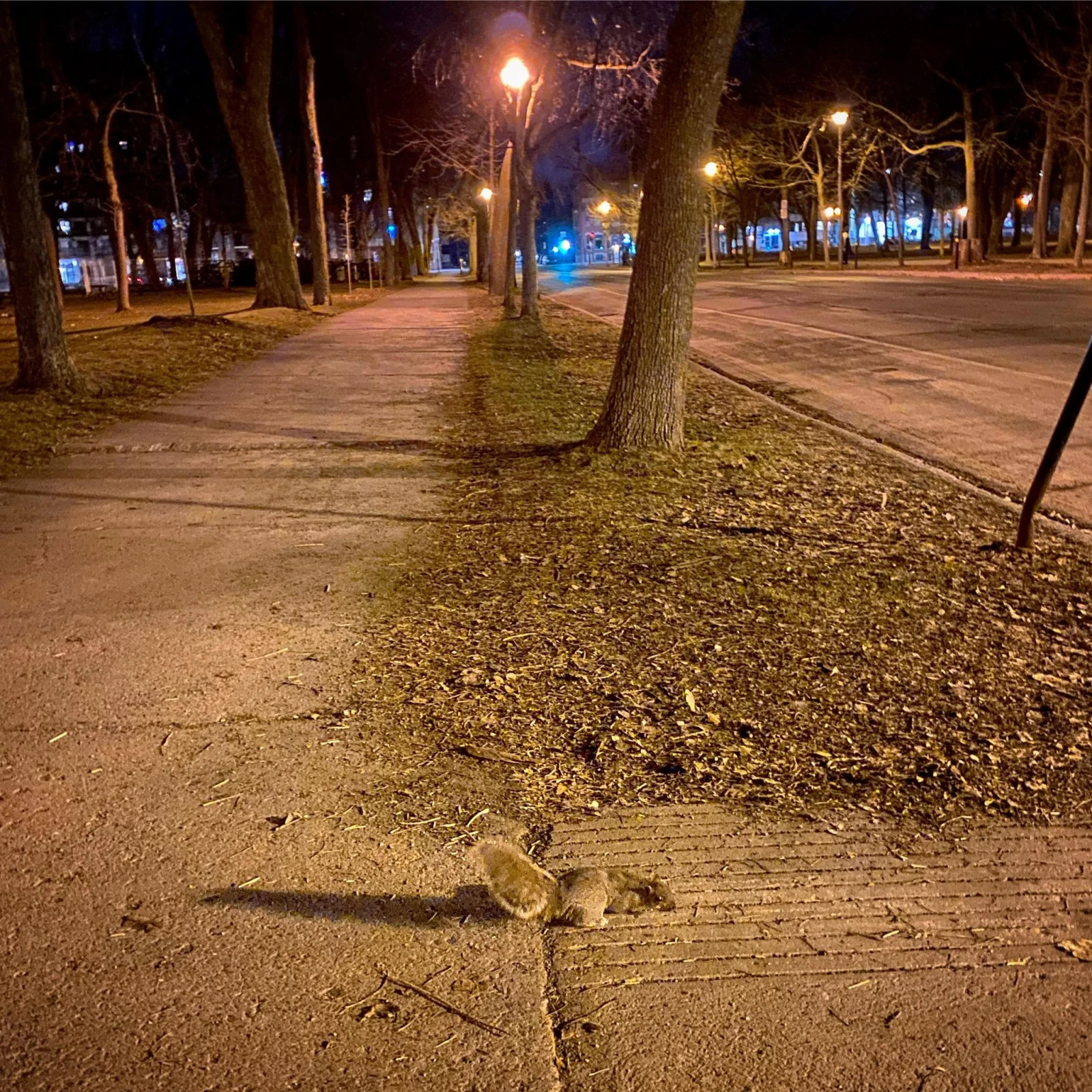 En retournant vers ma voiture, je vois sur le trottoir un écureuil en train de courir après sa queue. Je réalise n’en avoir vu aucun autre durant ma longue promenade dans le parc.