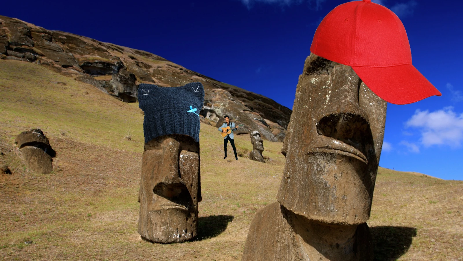 L’île de Pâques et Giovanni Apollo ont un point en commun: ils nous ont bernés depuis un méchant boute avec leur nom. En fait, l’île de Pâques s’appelle aussi Rapa Nui qui, en vieux dialecte chilien, veut dire: “Là où le wi-fi rentre pas top top.” C’est compliqué, ces affaires d’identité. Faudrait pas qu’on apprenne en plus que les statues, c’est pas de la vraie vraie pierre, mais d’la garnotte cheap.