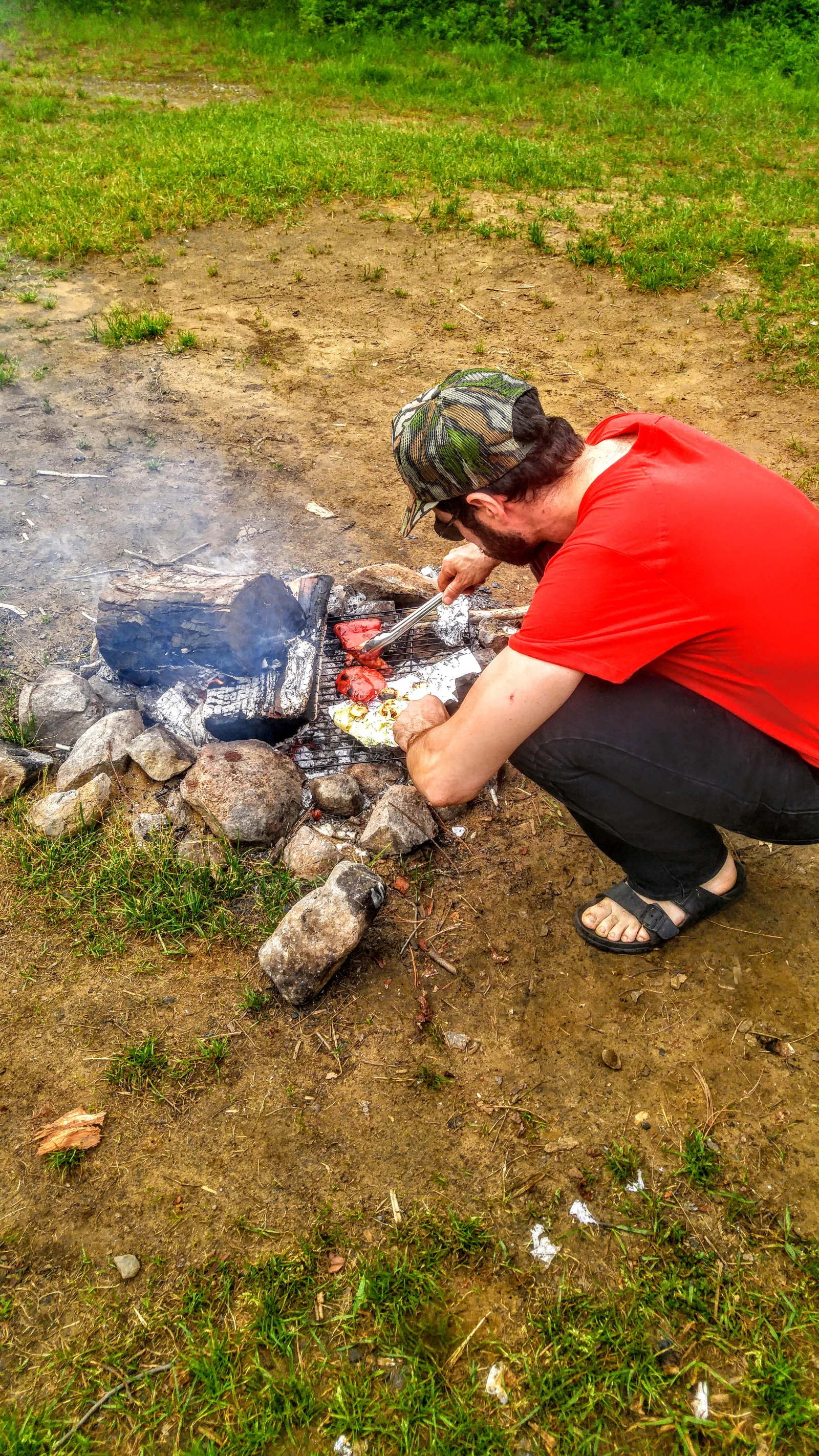 On a beau avoir deux ronds au propane, un BBQ, un petit four, un micro-ondes et trois ronds au butane, y’a rien de plus “mâle” que de faire la cuisson direct sur le feu. «En plus, tu devrais me remercier, ça éloigne les moustiques», qu’il m’a dit. L’expérience lui fait maintenant dire que NON. La fumée n’éloigne pas les maringouins! Un bref regard à ses pieds permet de réaliser à quel point il a eu mal “aux piqûres” dans ses petites chaussures de vélo trop serrées, pendant les semaines qui ont suivi.