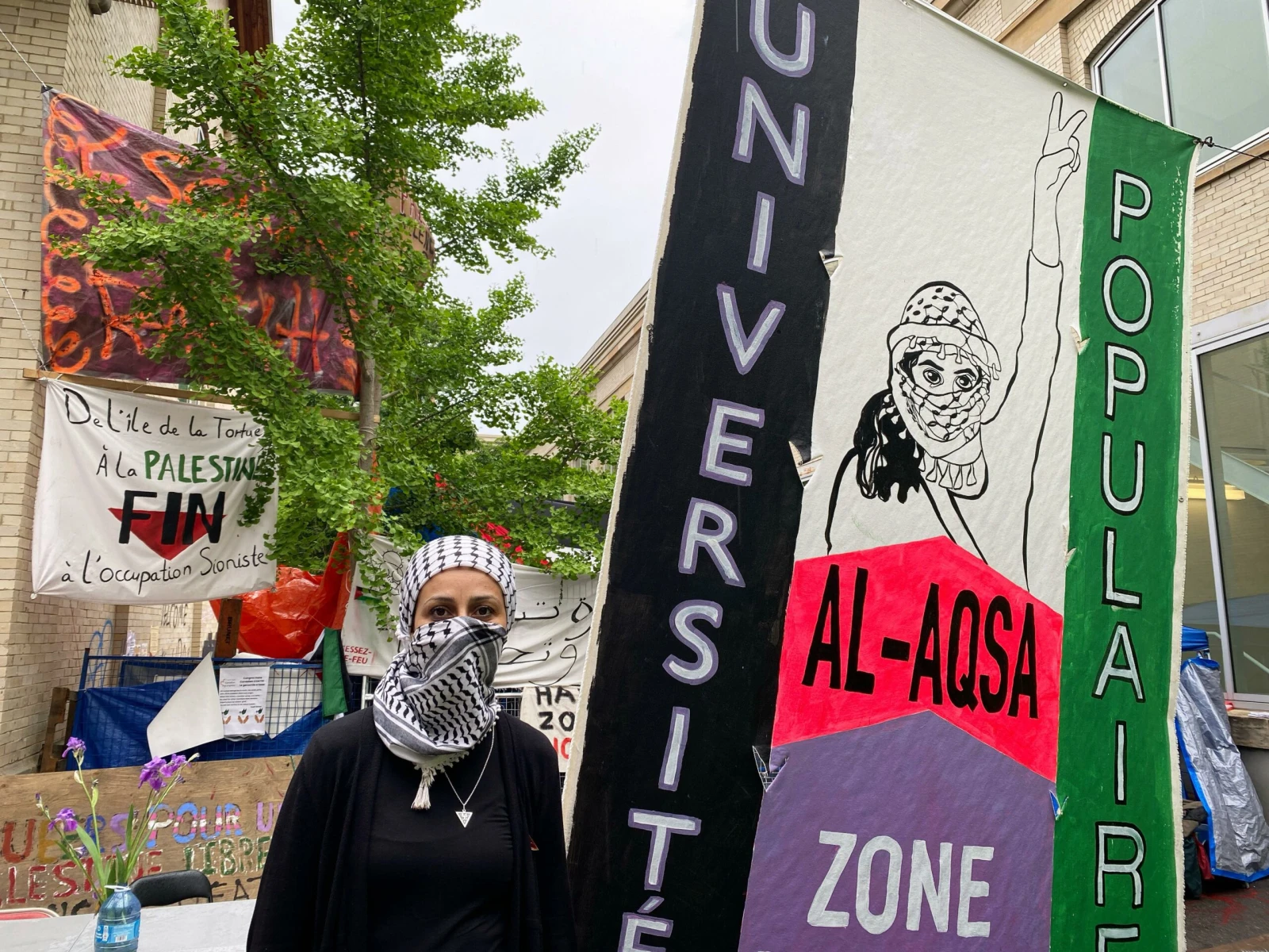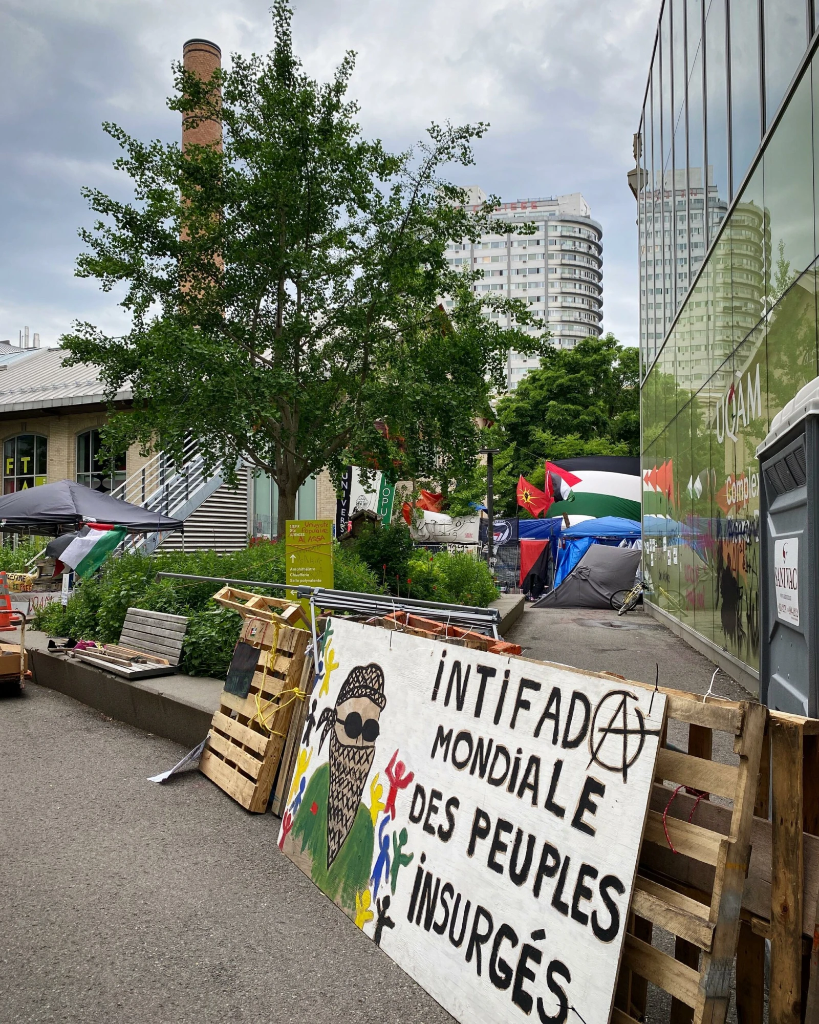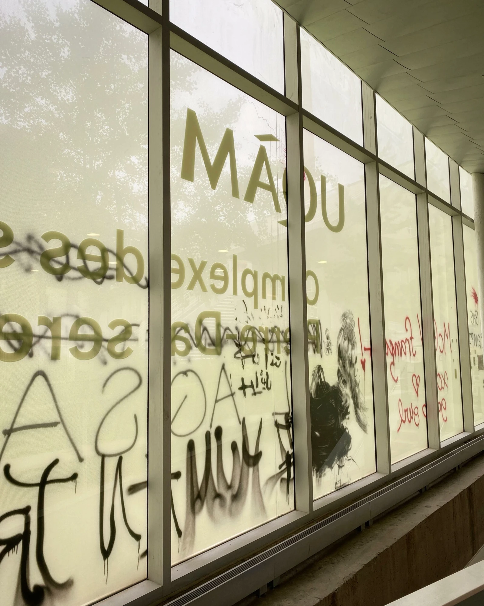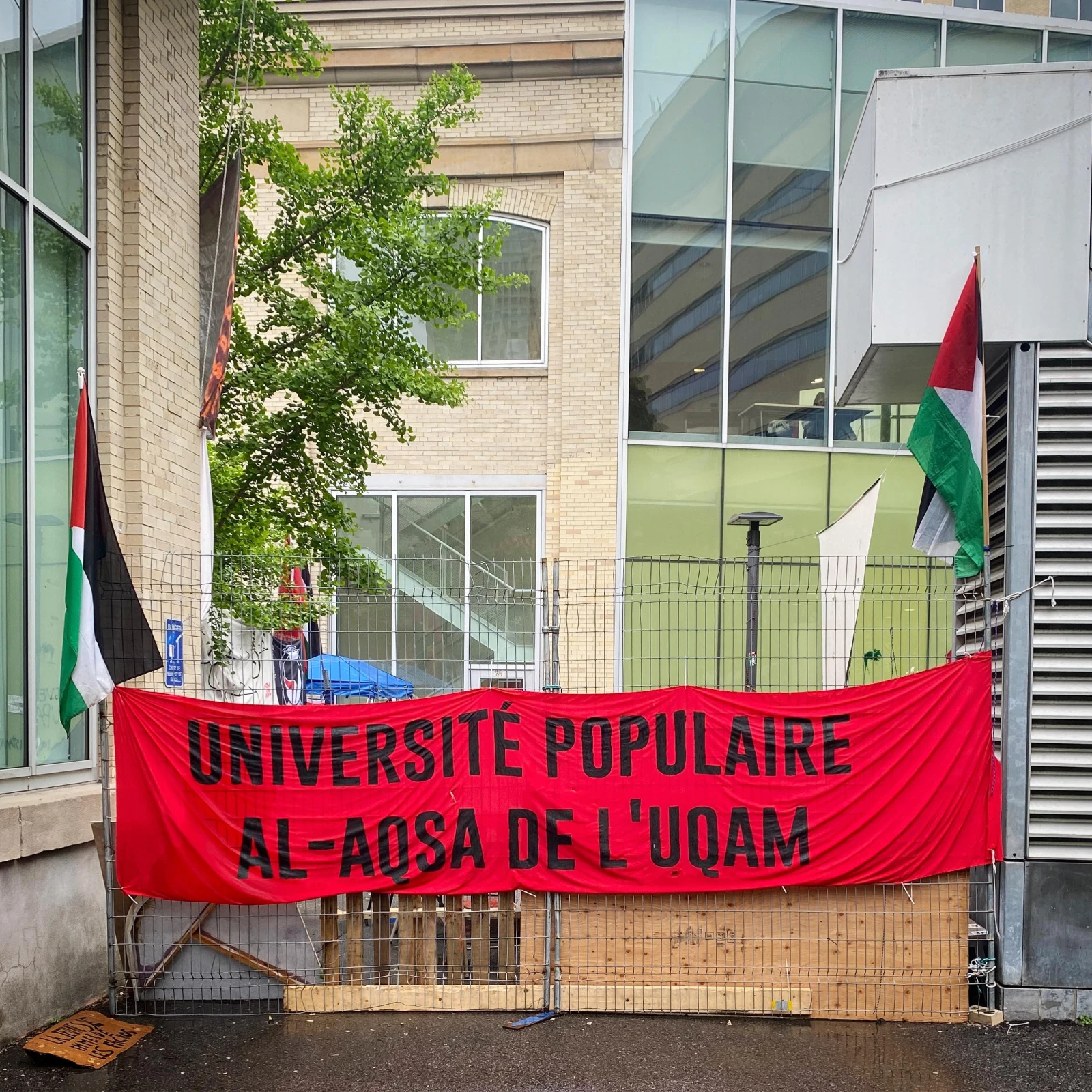 « Université Populaire Al-Aqsa de l’UQAM », « Free Palestine! », « Viva intifada » : les graffitis et slogans propalestiniens tapissent les murs et les vitrines du pavillon universitaire.
