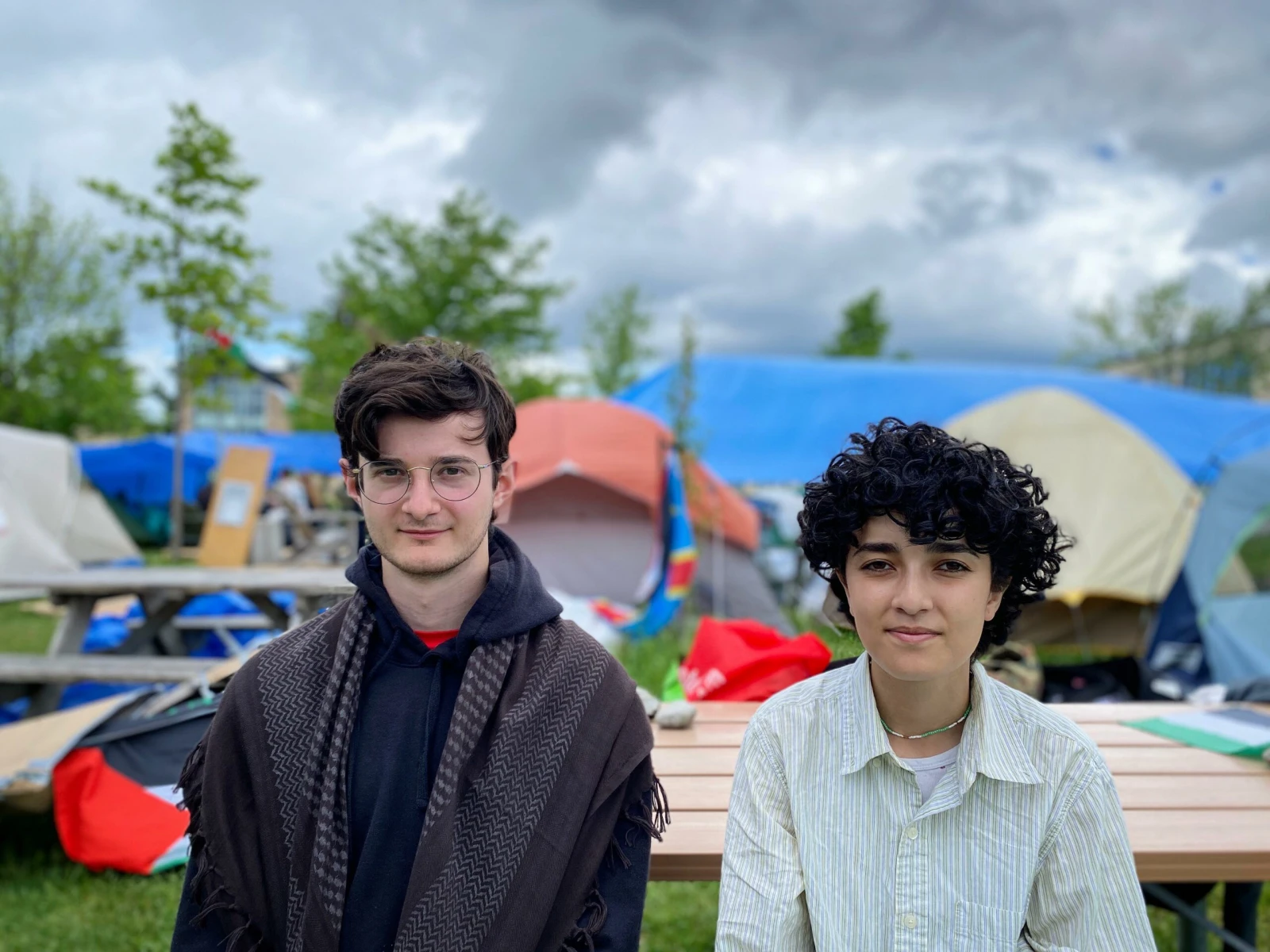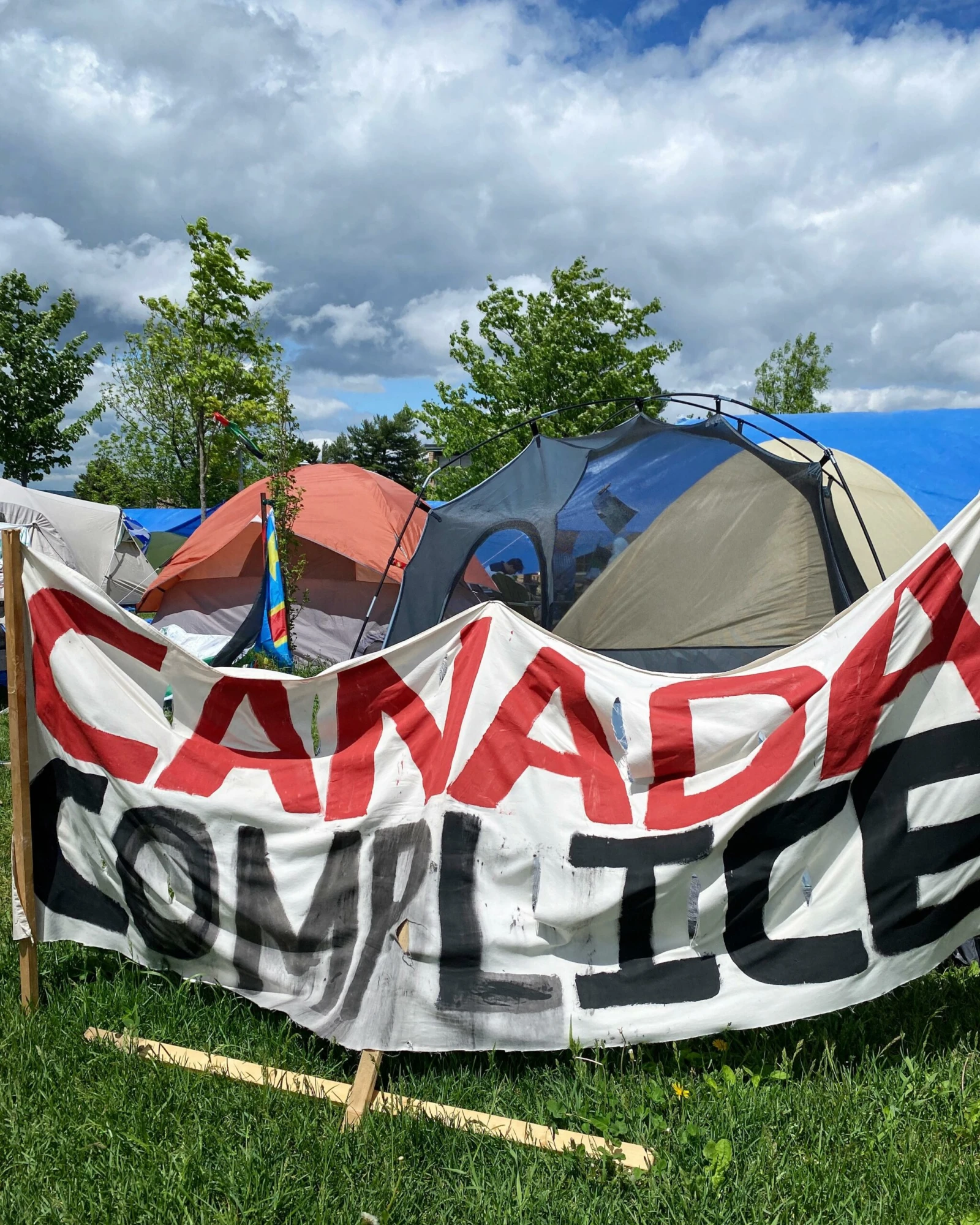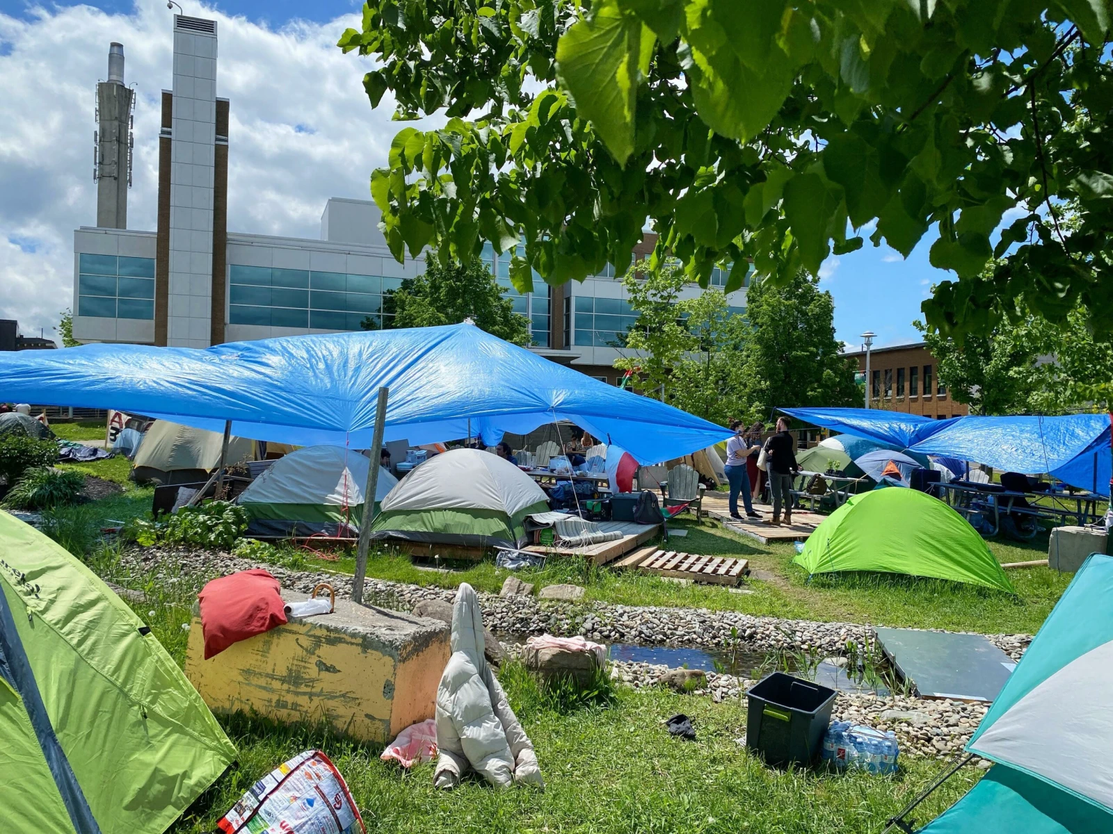 Le contraste entre les étudiants qui déambulent sur le campus et l’immense camp étalé sur une grande superficie de la pelouse est frappant.