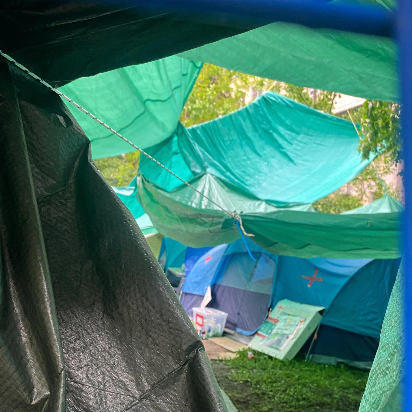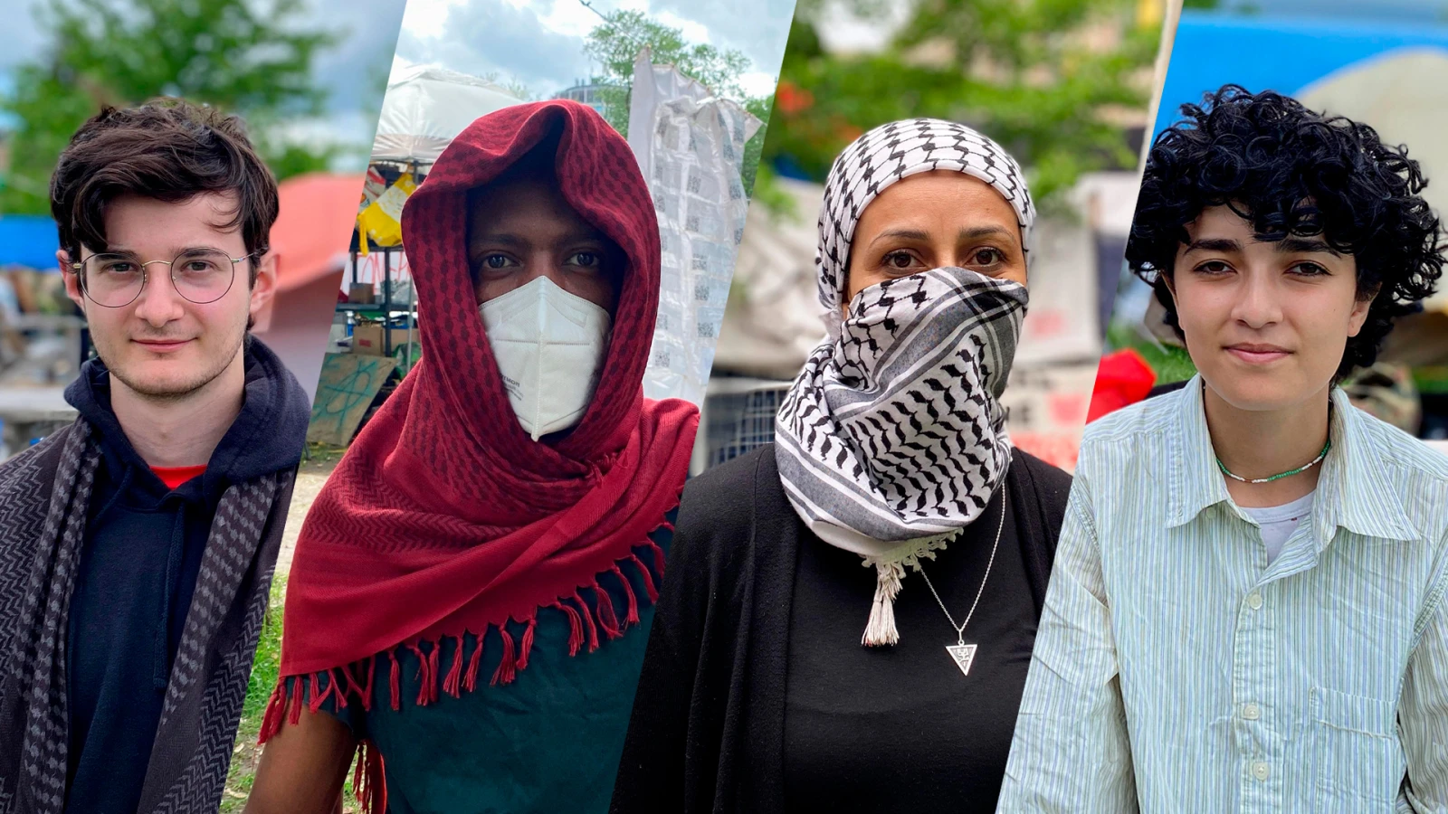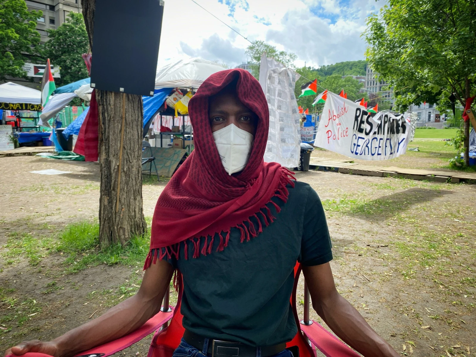 Le contraste entre les étudiants qui déambulent sur le campus et l’immense camp étalé sur une grande superficie de la pelouse est frappant.