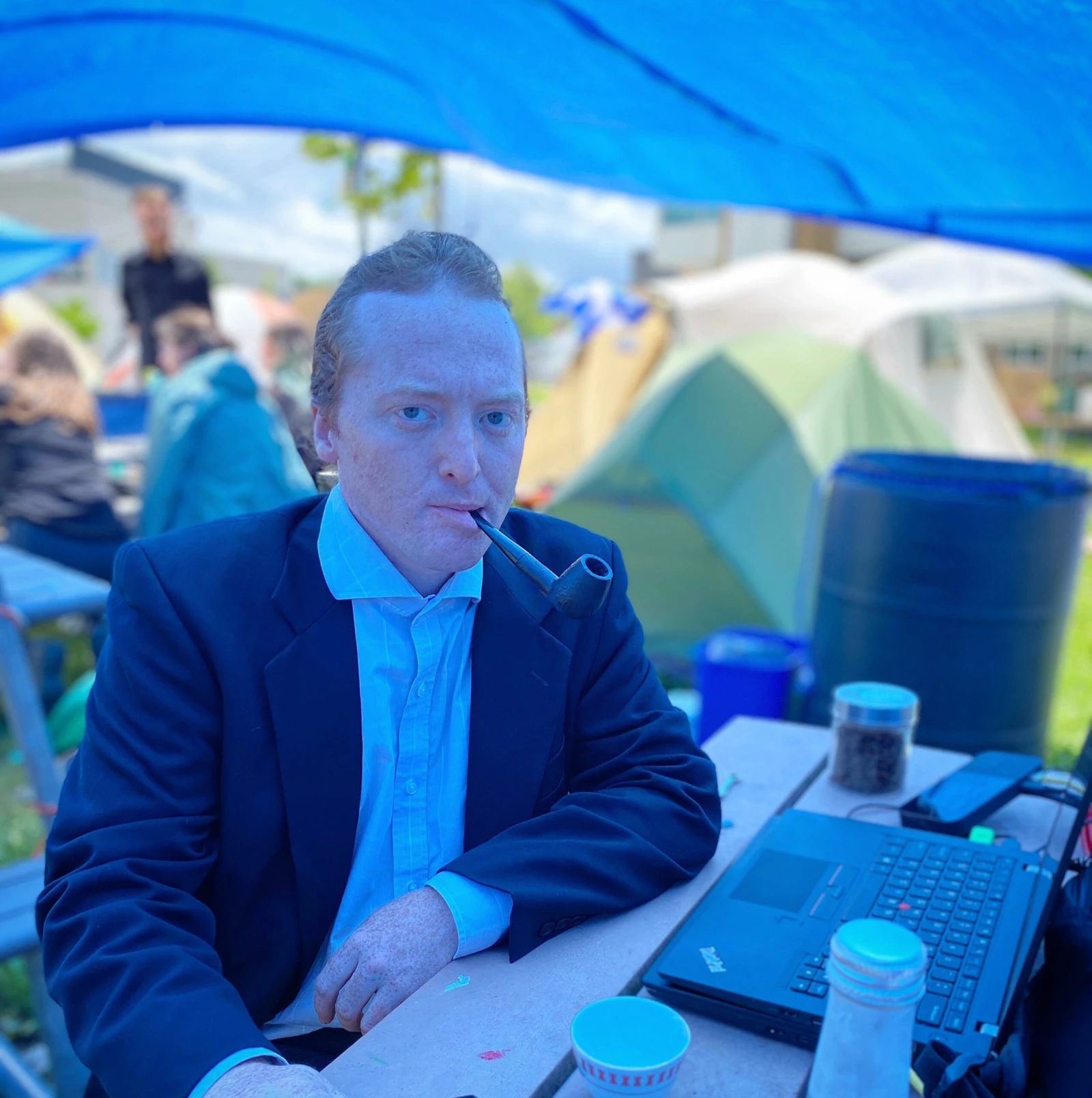 Je me dirige vers le campement, où une poignée de militants sont rassemblés à l’ombre d’une tente, assis à une table de pique-nique. L’accueil, chaleureux, est à des années-lumière de celui vécu la veille à l’UQAM.