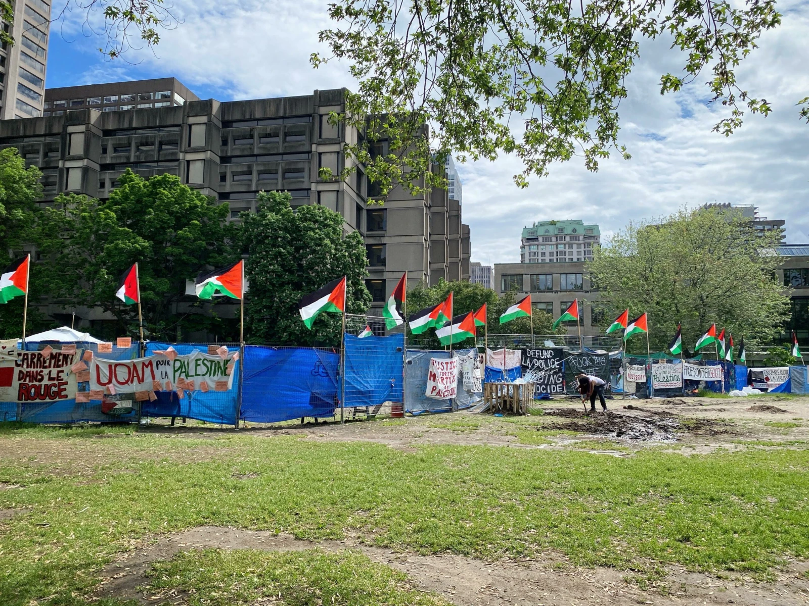 Dans la cour intérieure du Complexe des sciences Pierre-Dansereau, le campement est ceinturé de clôtures, faisant figure de village gaulois résistant à l’envahisseur.