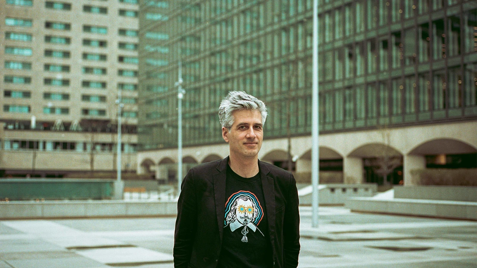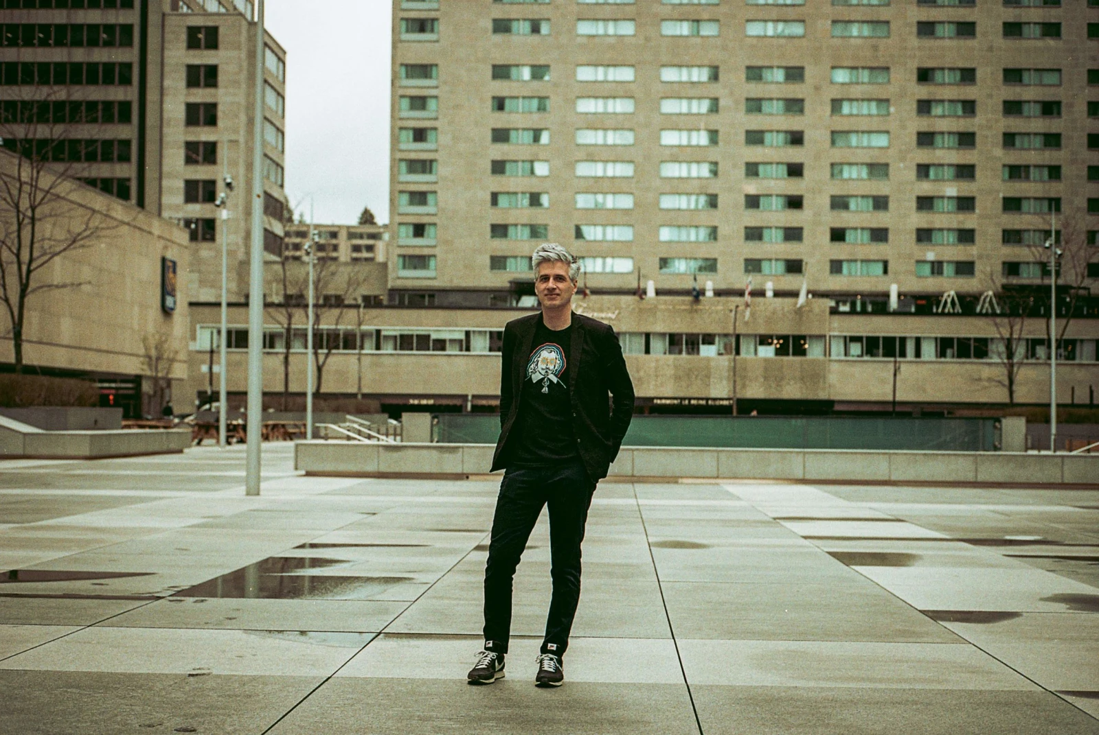 Nous nous donnons rendez-vous sur l’Esplanade Place Ville Marie, précisément là où s’élèvera la bague de 30 mètres de diamètre. Aux alentours, le centre-ville semble engourdi au son des travaux qui s’éternisent dans l’indifférence. La croix du mont Royal et la silhouette gothique de l’Université McGill animent l’horizon. Les gens se prennent en photo, errent, pointent la structure annoncée, confortables dans cette clairière emmurée par la verticalité.
