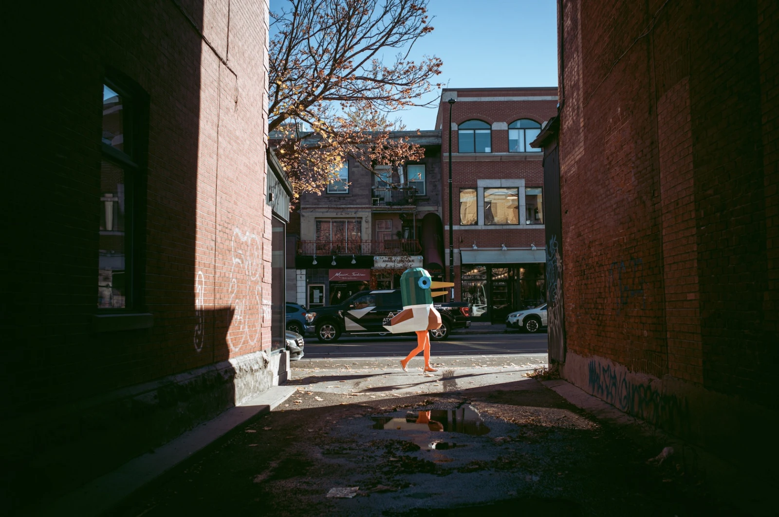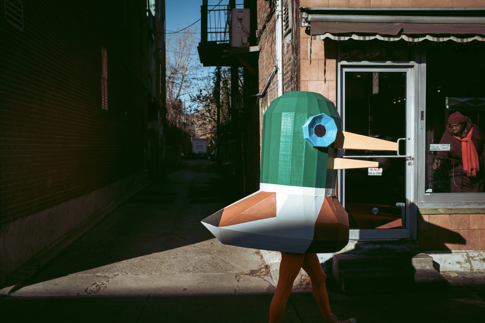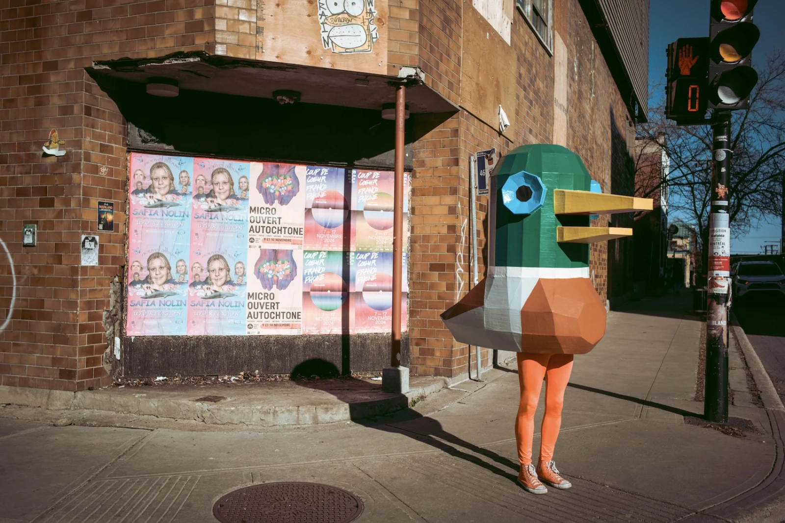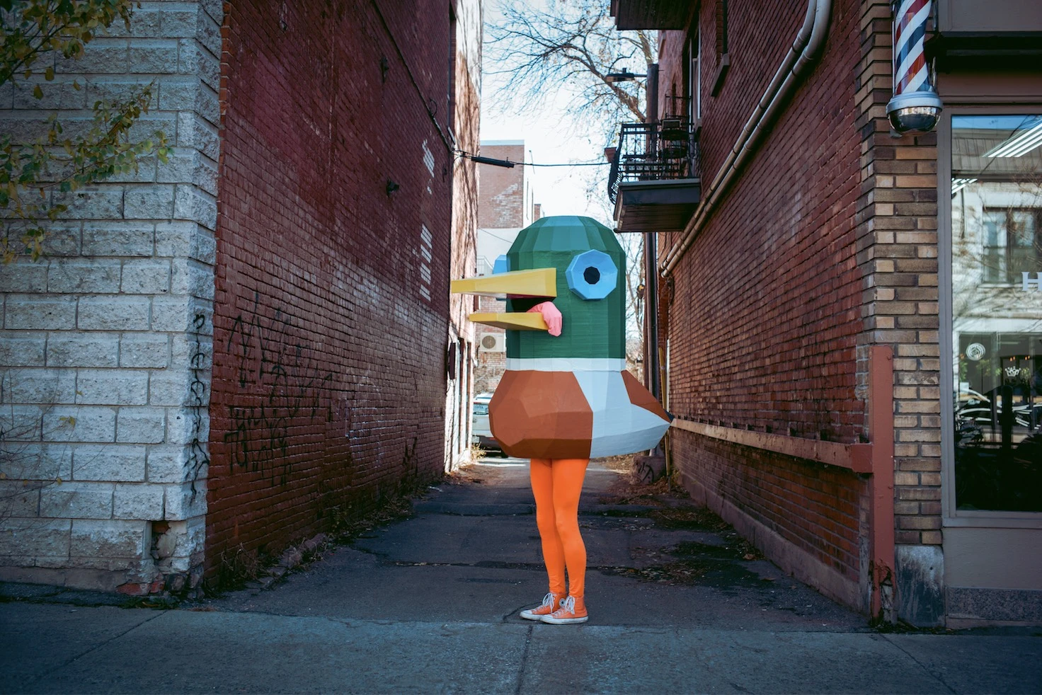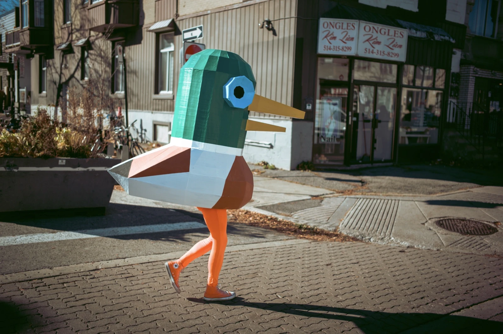 Le concept est aussi simple qu’inattendu : Lewis arpente les rues, vêtu de ses Converse orange et d’un legging assorti, dissimulé sous un canard géant, ne s’exprimant que par coassements. Mallard jongle avec l’absurde et l’anonymat, créant une distance subtile entre lui et son public, tout en ravivant chez eux une part d’émerveillement enfantin.