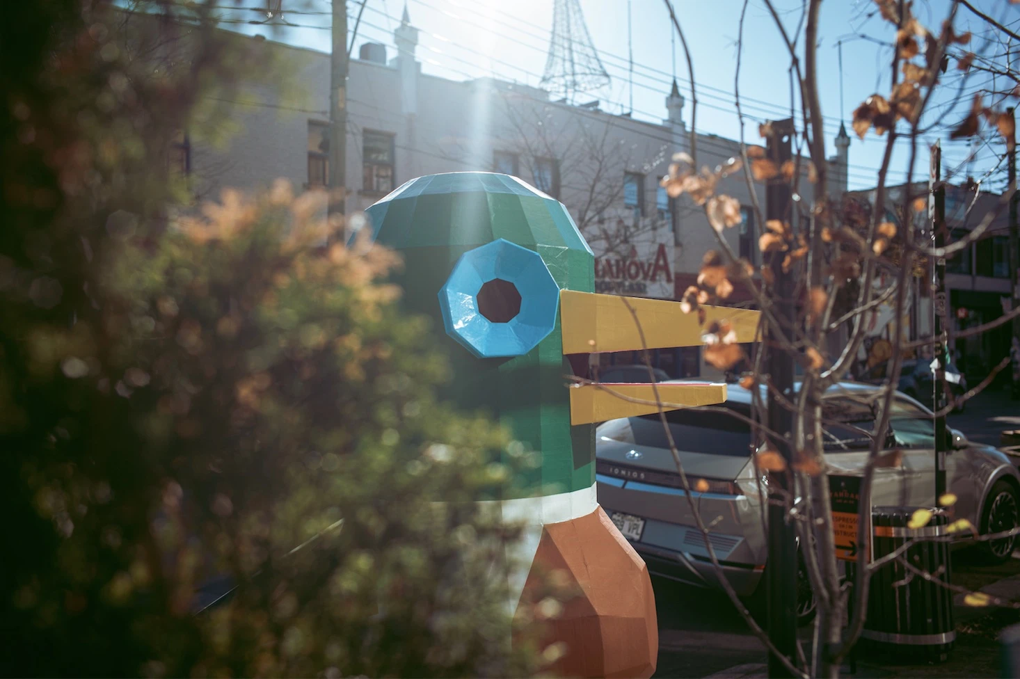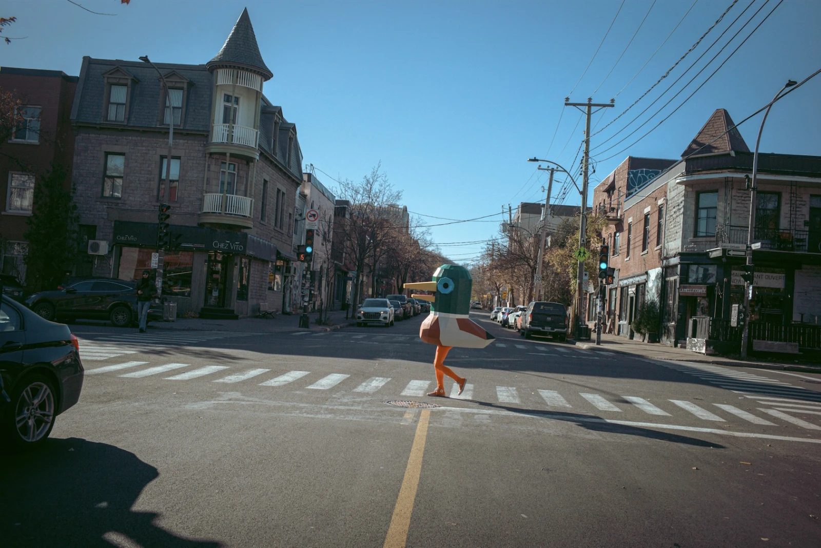 Sur la rue Saint-Viateur, nous croisons un groupe de touristes sud-coréennes, visiblement ravies à l’idée d’immortaliser l‘hallucination ailée. Lewis leur répond d’un coin-coin avec son sifflet de chasse au canard. Le ridicule de la scène est délicieux.