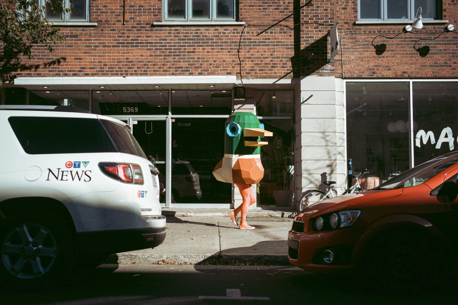 Il sort environ deux fois par semaine, selon la météo. La plupart de ses promenades durent environ deux heures, soit quelques kilomètres à travers les quartiers du centre de Montréal. « Je marche jusqu’à ce que je doive pisser », lance-t-il à travers son costume fait de papier mâché.