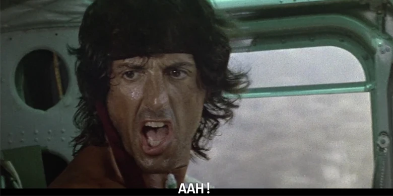 La série Rambo déborde de ces actes de violence trop ridicules pour être applicables à la vraie vie: il arrache la gorge d’un mec à mains nues (c’est tu possible de faire ça? Qui en aurait même l’idée?), il se bat à coups de rondins avec un stéréotype d’acteur asiatique des années 80, il se fait torturer avec une base de lit en métal, il fait exploser des gars dans des hélicoptères et il fait même exploser un pauvre gars à l’aide d’une flèche montée d’une bombe. Il y a beaucoup de monde qui explose dans ses films.