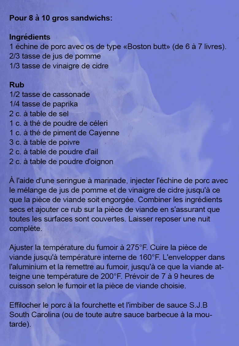 En bonus, on a demandé à Simon de nous donner sa recette de Pull pork au fumoir!