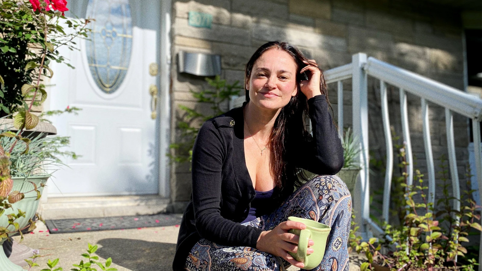 Lucie Laurier m’attend, assise dans les escaliers menant à sa maison, tisane en main.
