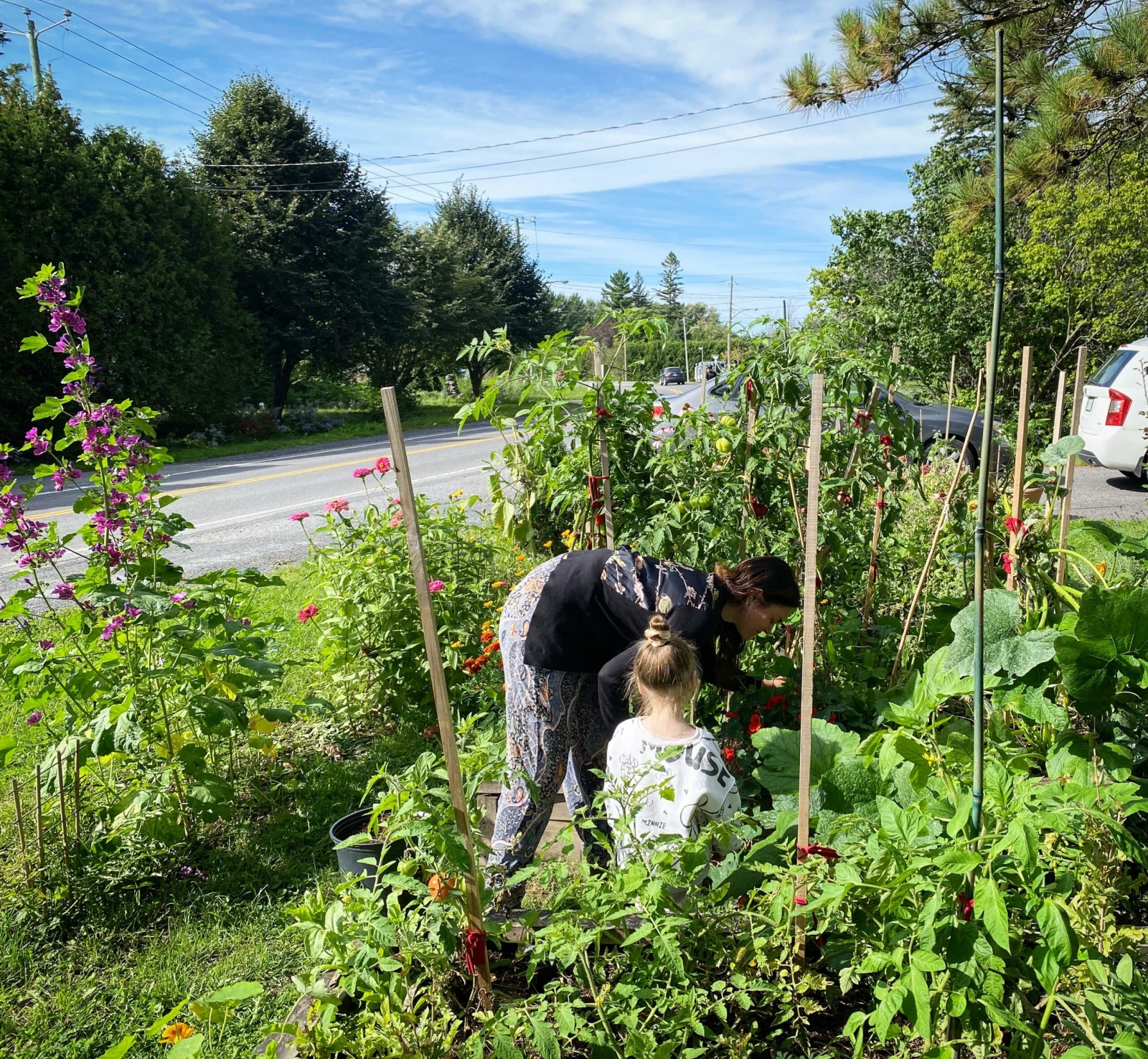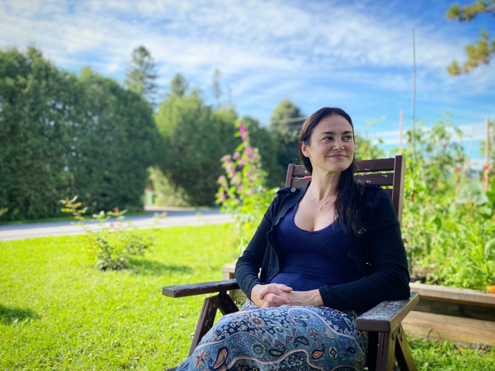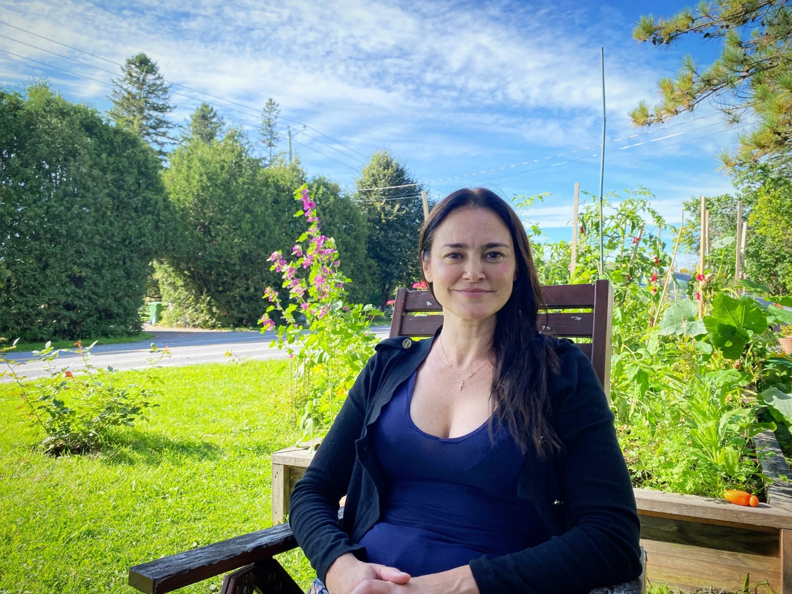 Le flot des voitures est parfois bruyant sur le chemin Sainte-Thérèse, me prévient Lucie, tandis qu’on s’installe sur des chaises de son terrain, en face de sa maison. Un beau jardin où poussent notamment des tomates se trouve à nos pieds. « Je ne connaissais rien là-dedans, mais j’entretiens tout ça depuis trois ans. Je suis toujours en apprentissage », explique l’agricultrice en herbe.