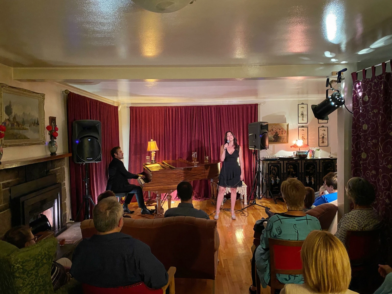 À l’intérieur, l’ambiance est feutrée et le salon de l’après-midi ressemble maintenant à une salle de spectacle, avec les rideaux rouges ceinturant la pièce, l’éclairage et les chaises réparties en deux sections.