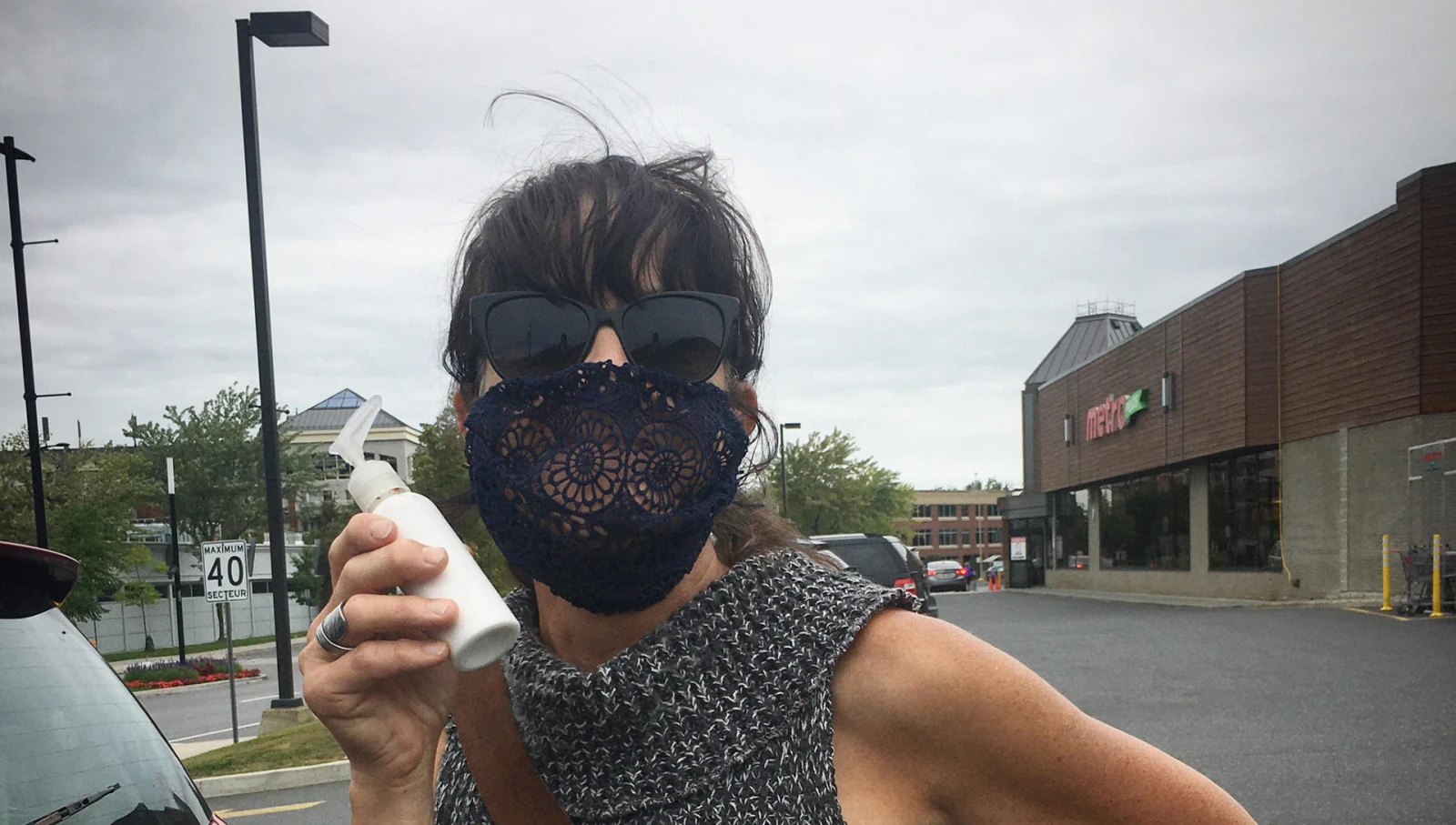 Le mont Saint-Hilaire se dresse, majestueux, au loin. C’est sûrement la plus belle vue au monde pour un supermarché. Le gars à la porte nous fait signe de mettre le produit désinfectant, mais Chantal pointe sa bouteille en plastique.