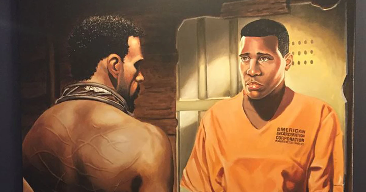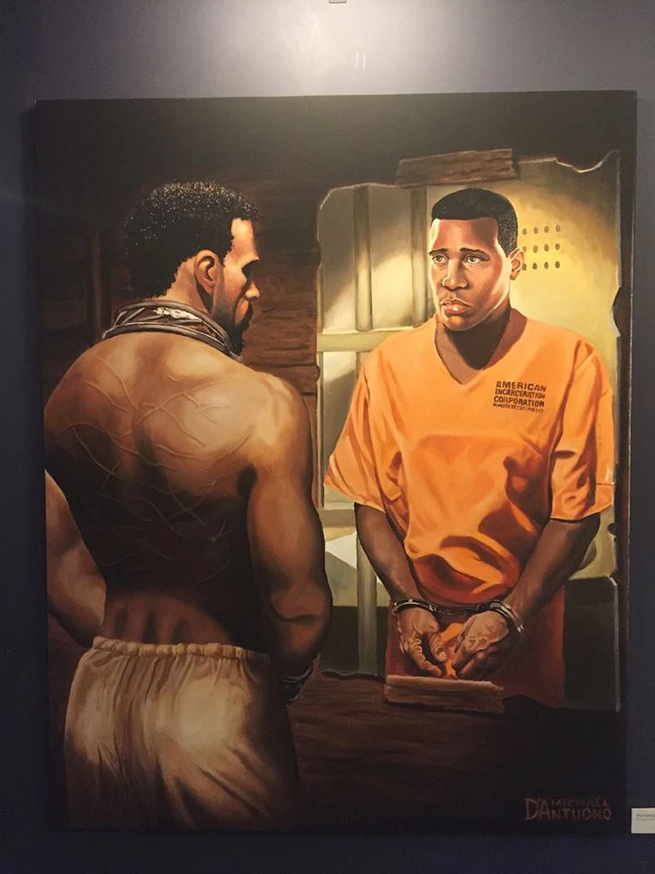 Le peintre pose la question simple à savoir si la condition des noirs à évolué tant que ça depuis l’esclavage? Est-ce que la surpopulation afro-américaine dans les prisons ne représente-t-elle pas une certaine forme d’esclavage plus moderne? Une grande partie de la faune carcérale se compose de criminels reliés de près ou de loin au contrôle de la drogue. Si t’enlèves les prisonniers incarcérés pour des crimes mineurs reliés à la drogue, tu fais ben d’la place, mettons.