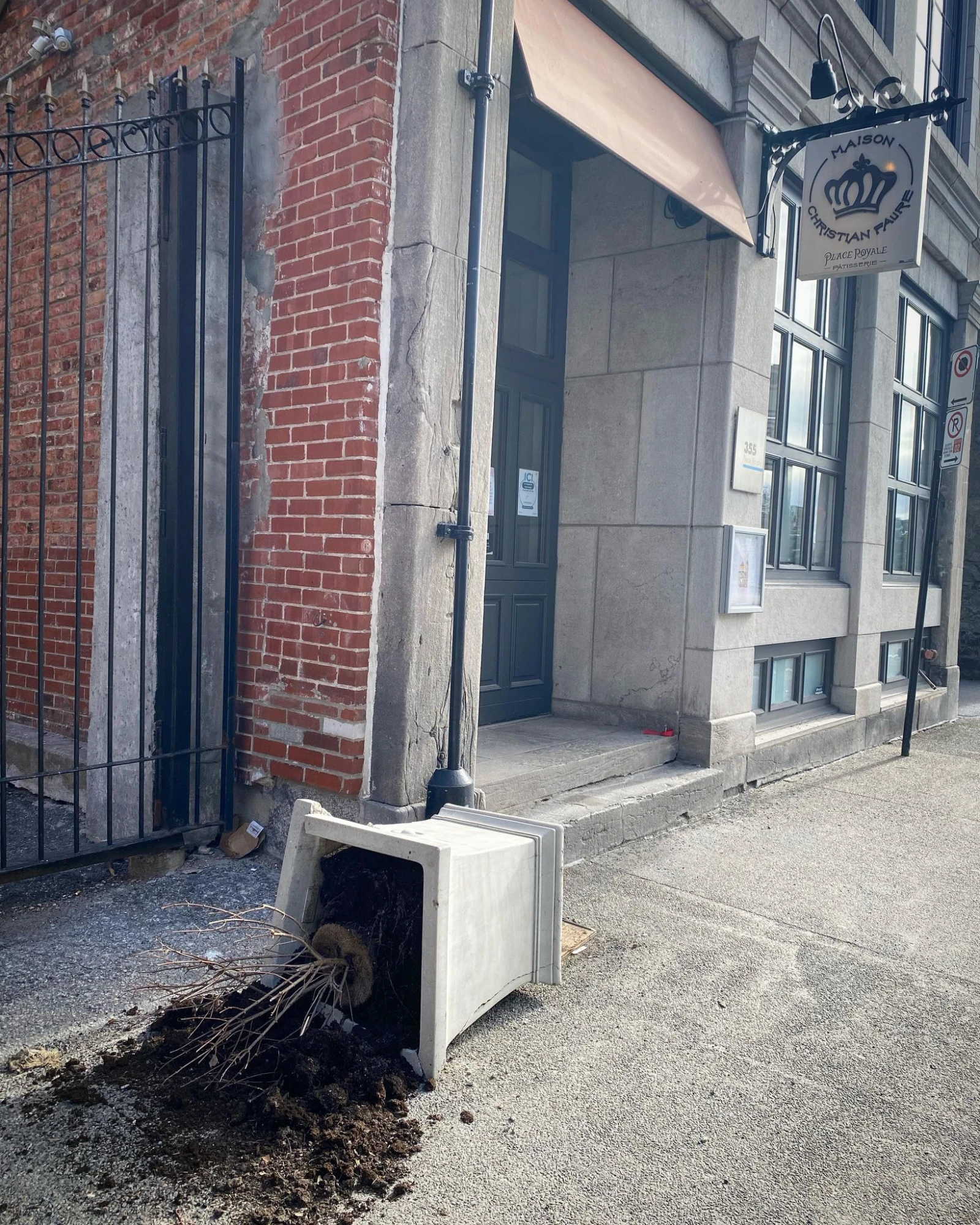 L’image la plus absurde de cette casse est sans doute cette plante renversée près de la Commune. On imagine mal ce qui peut se passer dans la tête des « révolutionnaires » qui s’en prennent ainsi à la botanique urbaine. « Quin Legault, Quin Arruda! LIBARRRTÉ!! »