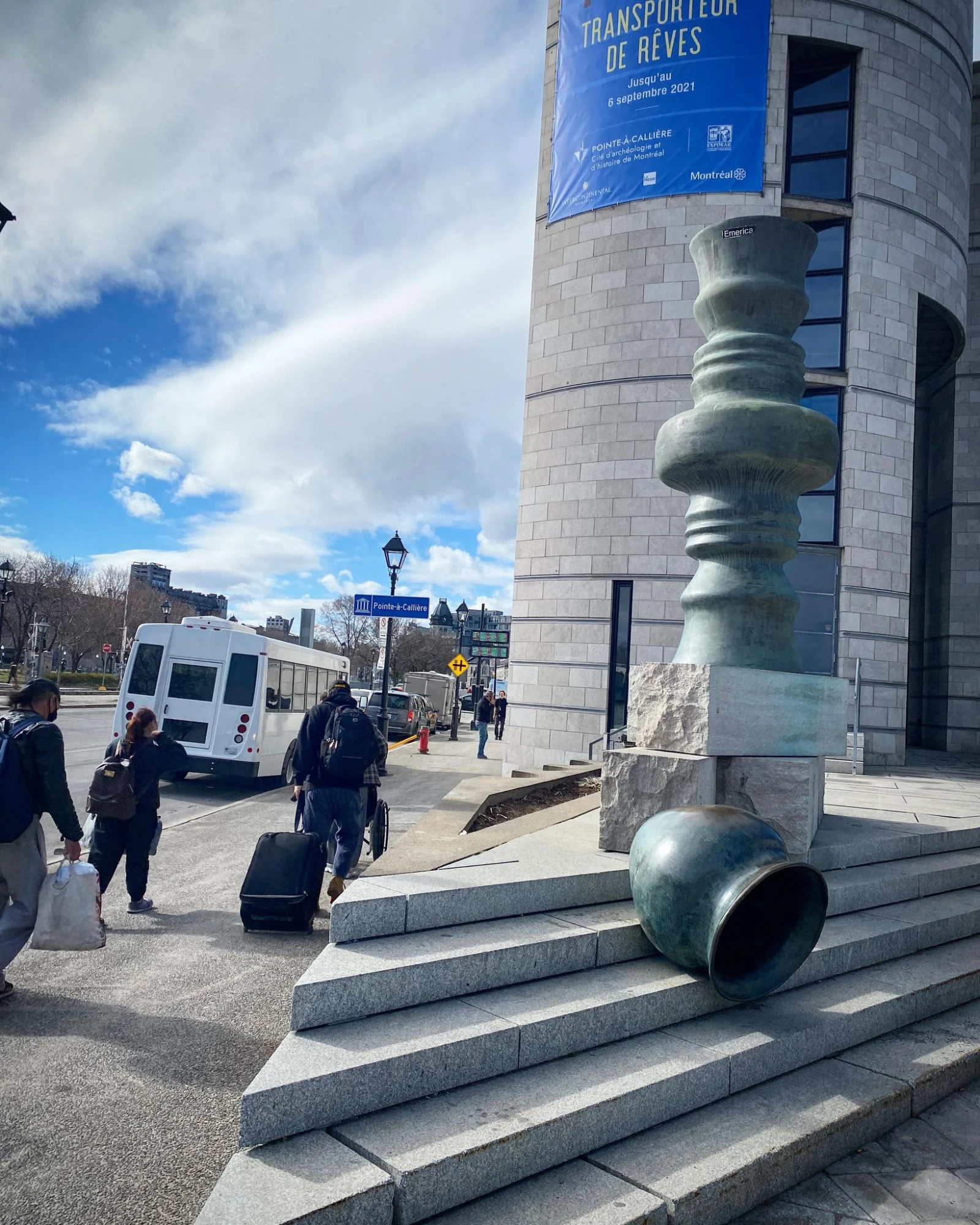 J’ai aussi vu un gros vase en fonte renversé devant le musée Pointe-À-Callière, mais je crois (j’espère) que ça fait partie du concept.