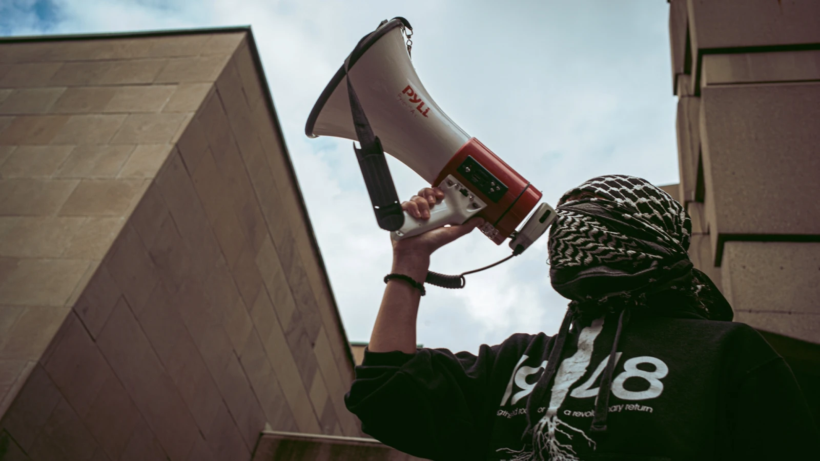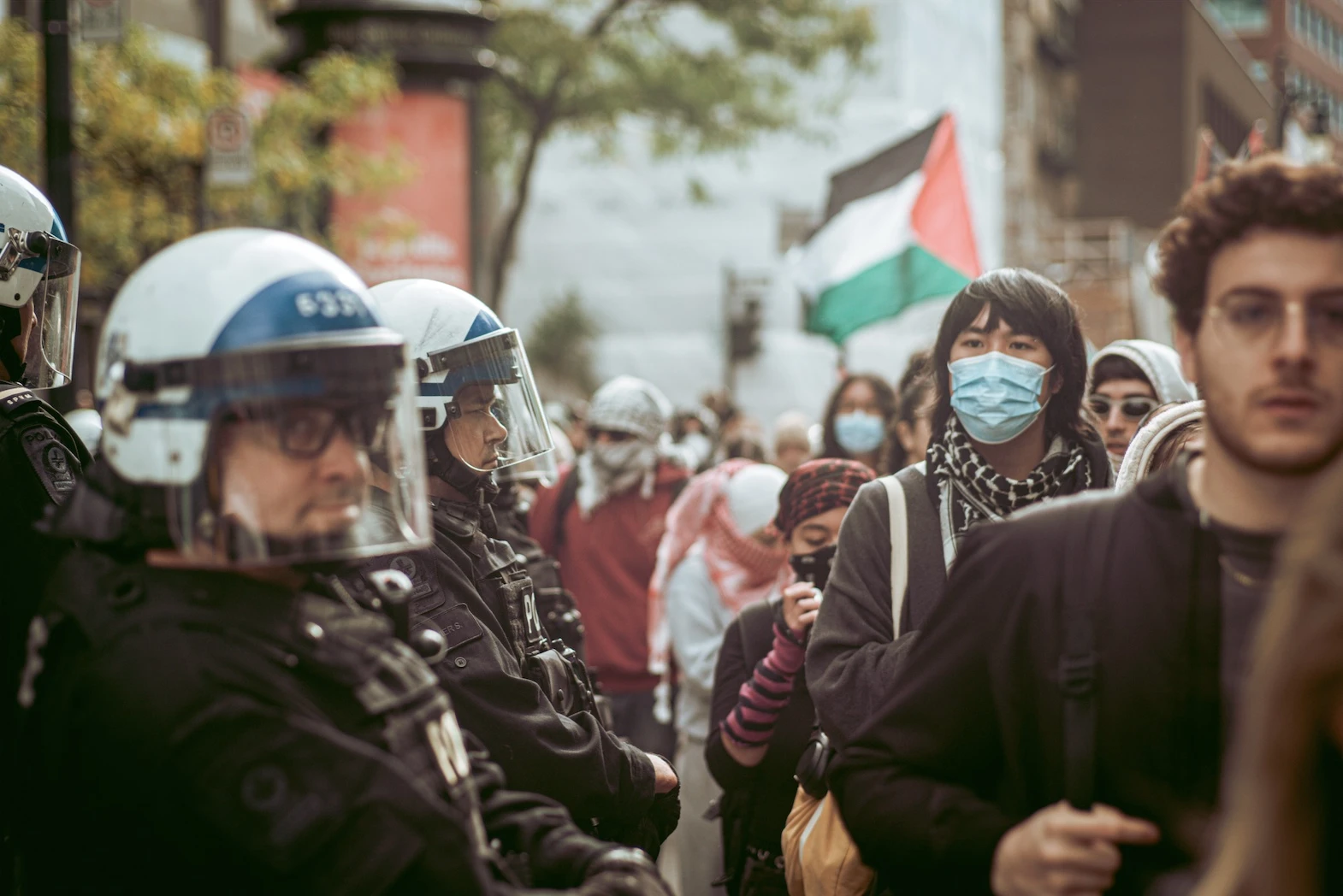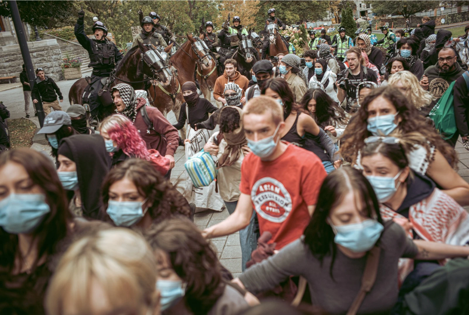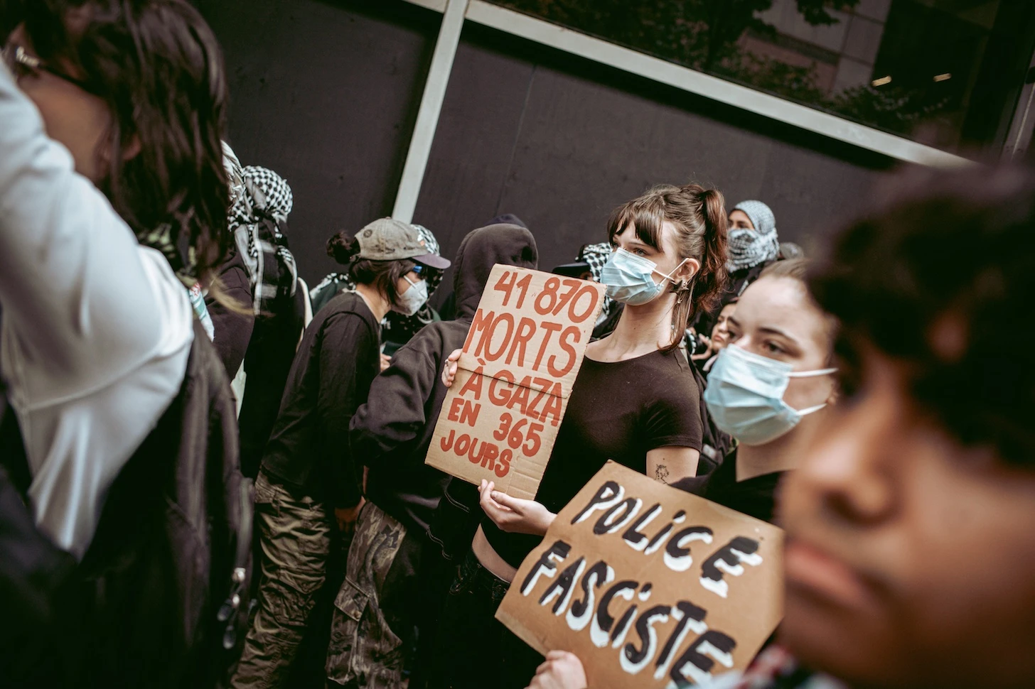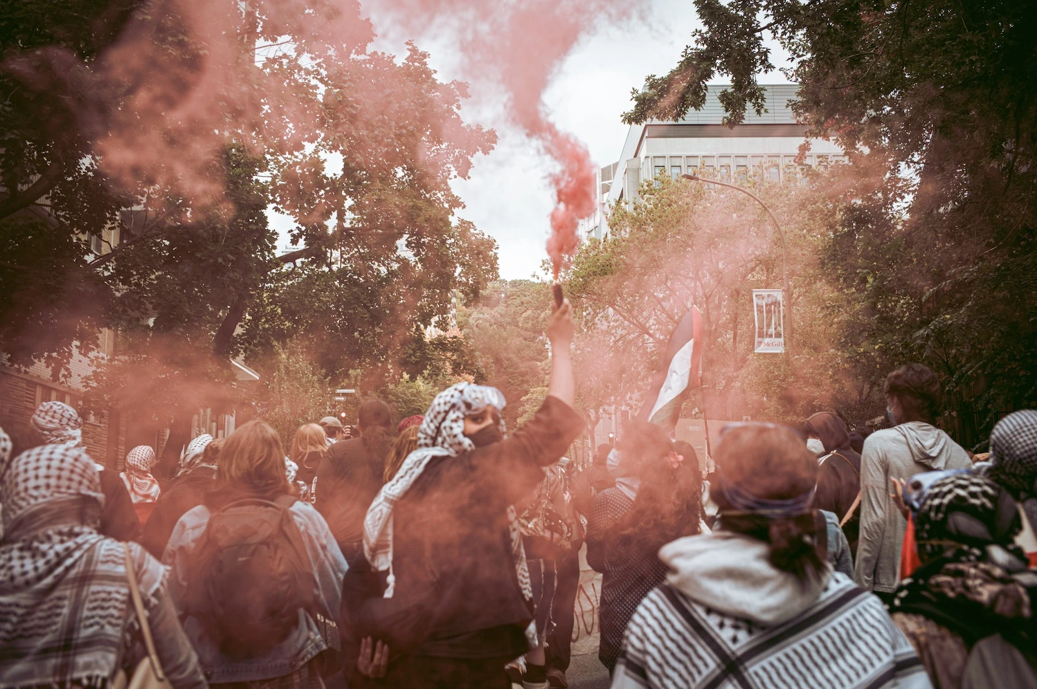 Le groupe rejoint le reste de la manifestation devant la bibliothèque face à un cordon de policiers anti-émeutes. Les grenades lacrymogènes éclatent, et dans la fumée rose, les manifestants s’éloignent, scandant : « Libérez la Palestine ! », la voix éreintée par l’usure.