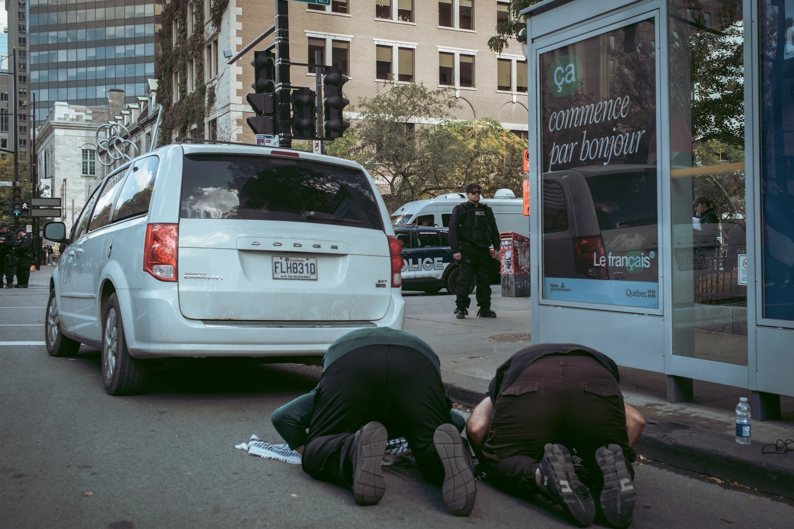 Entre les deux camps, un barrage de policiers du SPVM et de la SQ. Ils sont partout : à vélo, à moto, à cheval. Face à l’escalade des tensions, des renforts ont été déployés, non seulement pour sécuriser les campus, mais aussi pour protéger les lieux de culte dans les quartiers à risque. L’objectif est clair : rassurer autant les communautés juive qu’arabo-musulmane, dans un climat d’insécurité.