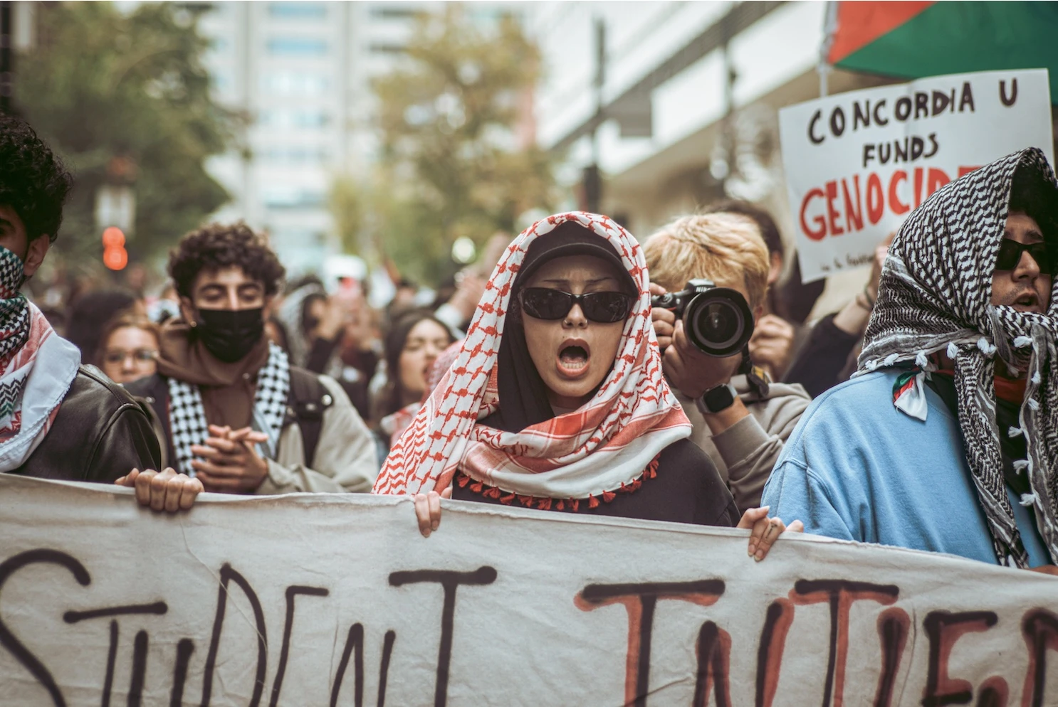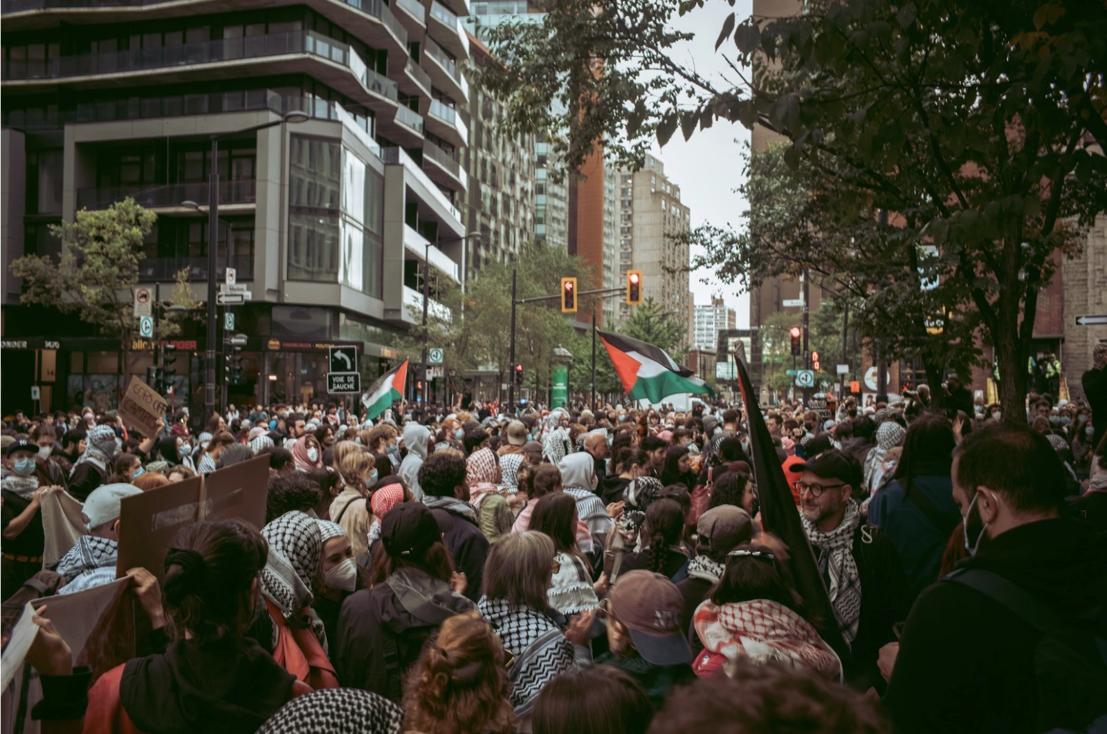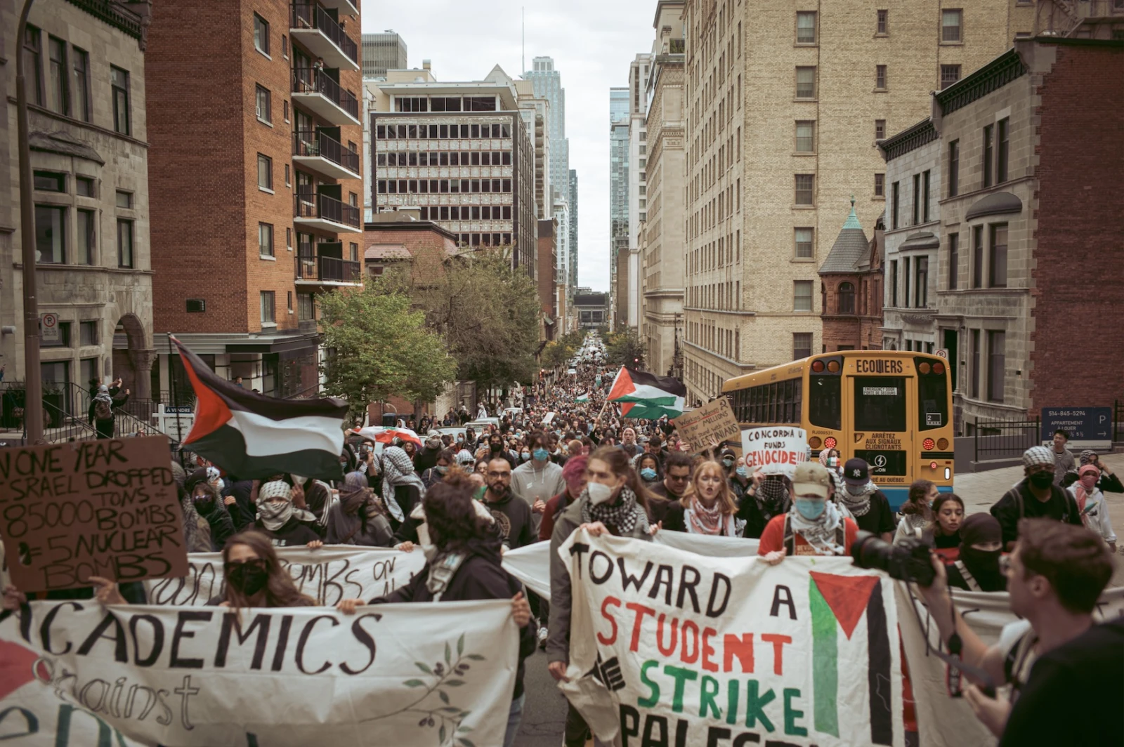 Parmi la foule, Justine, étudiante à l’Université de Montréal, est là « pour ne pas être complice d’un crime de guerre que l’Histoire finira par juger à sa juste valeur ». Andrea, de Concordia, martèle que sa présence est « un refus de s’agenouiller devant les grandes puissances. Rester humaine face à un génocide qui se déroule sous nos yeux. C’est un geste de solidarité envers les opprimés de toutes les nations. »