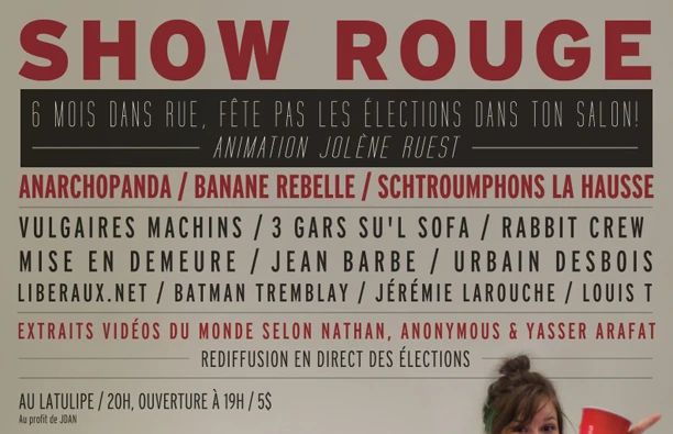 Me semble que j’ai juste envie qu’on soit tous ensemble pour fêter nos efforts, nos souliers usés pis le kit de casseroles de camping défoncé à coup de cuillère. Fêter avec l’anarcho, l’black bloc pis ma mère. Pis tous les gauchistes. Tsé, chez moi à bonne franquette. J’vous l’dis, j’vas faire du gâteau. À l’école, mes partys avaient une maudite bonne réputation. Pis si y fallait qui soit réélu, ben, on va s’serrer les coudes en gang. Pis s’il est échu, on va lever le coude. Échu ou réélu, sur Papineau, on va être juste su’l bord de la rue pour continuer le mouvement là où y est né et où il va continuer.