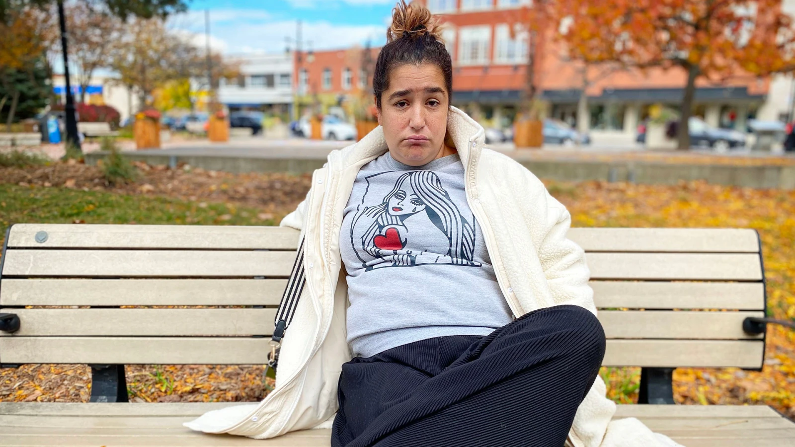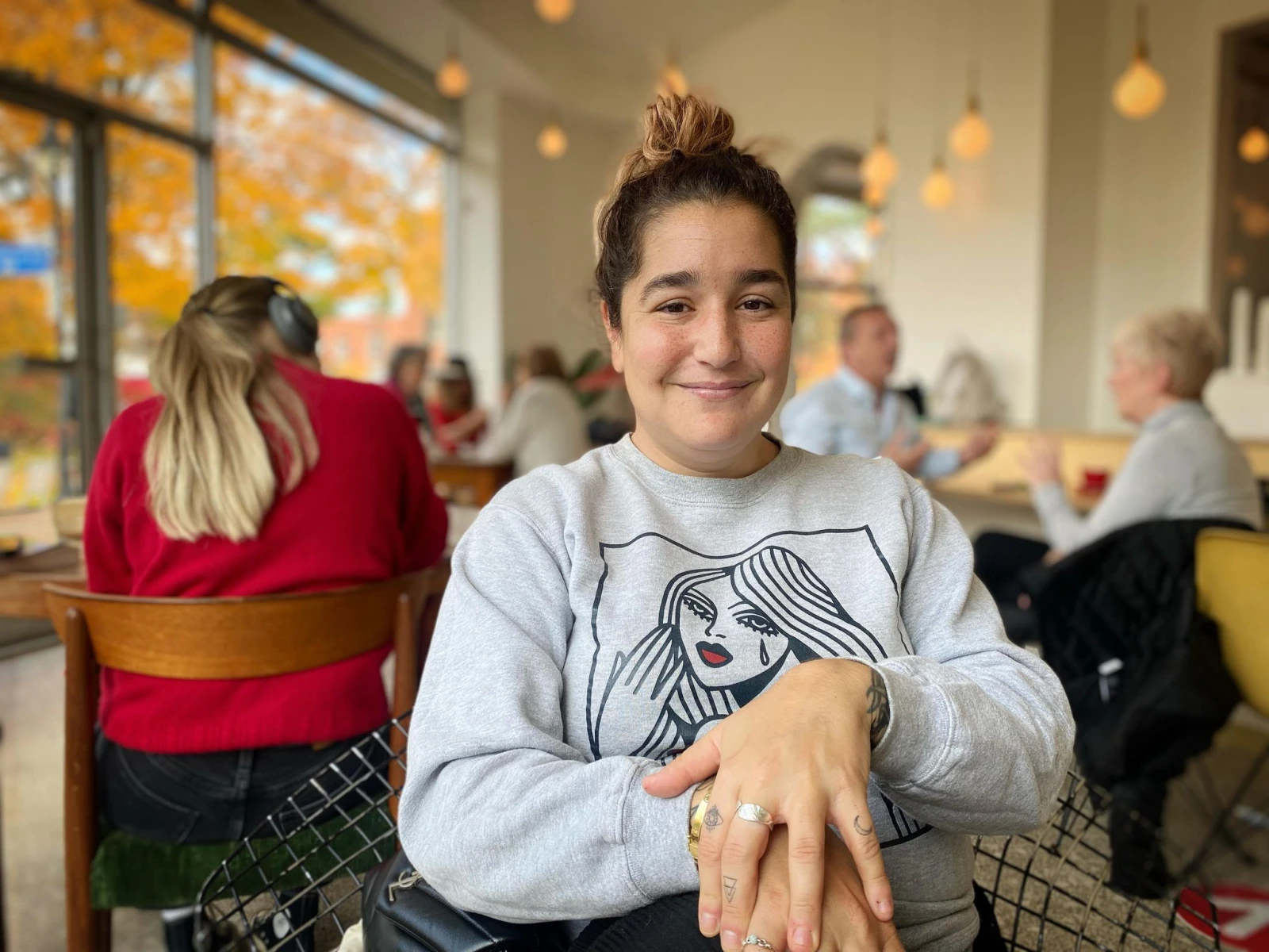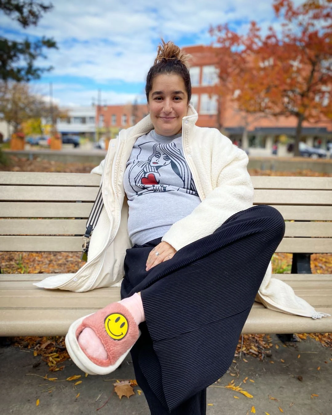 Le rendez-vous dans le café est par contre bien réel. L’autrice de l’heure s’installe devant un croissant et un café dans l’établissement achalandé. Elle porte des vêtements décontractés, jusqu’aux pantoufles « don’t worry be happy » dans chaque pied.