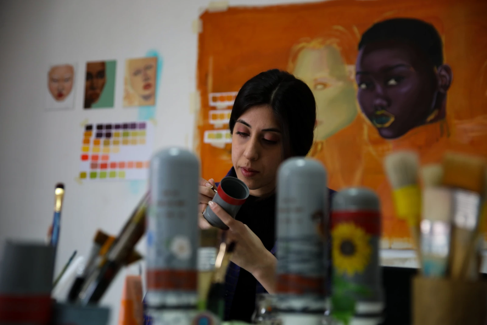 Pour discuter avec Marie-Alice Berberi, il faut déjà s’assurer qu’elle est bien disponible, puis la rejoindre sur son lieu de travail au Liban, à une petite dizaine de mètres de hauteur, en haut du mur qu’elle est en train de peindre. Ensuite, il faut éviter les pots de peinture – et de tomber. Enfin, la rencontre peut officiellement commencer.