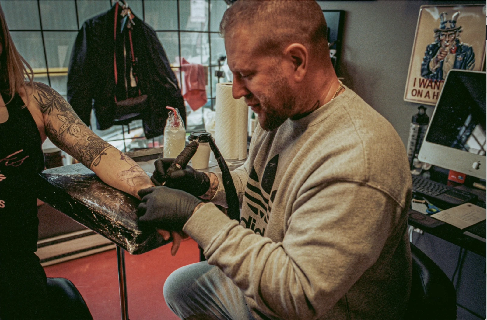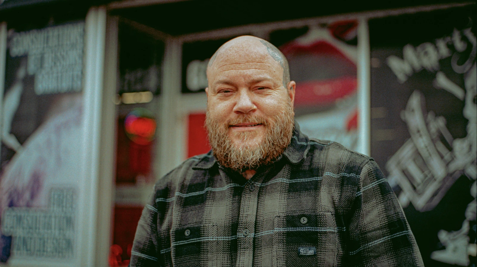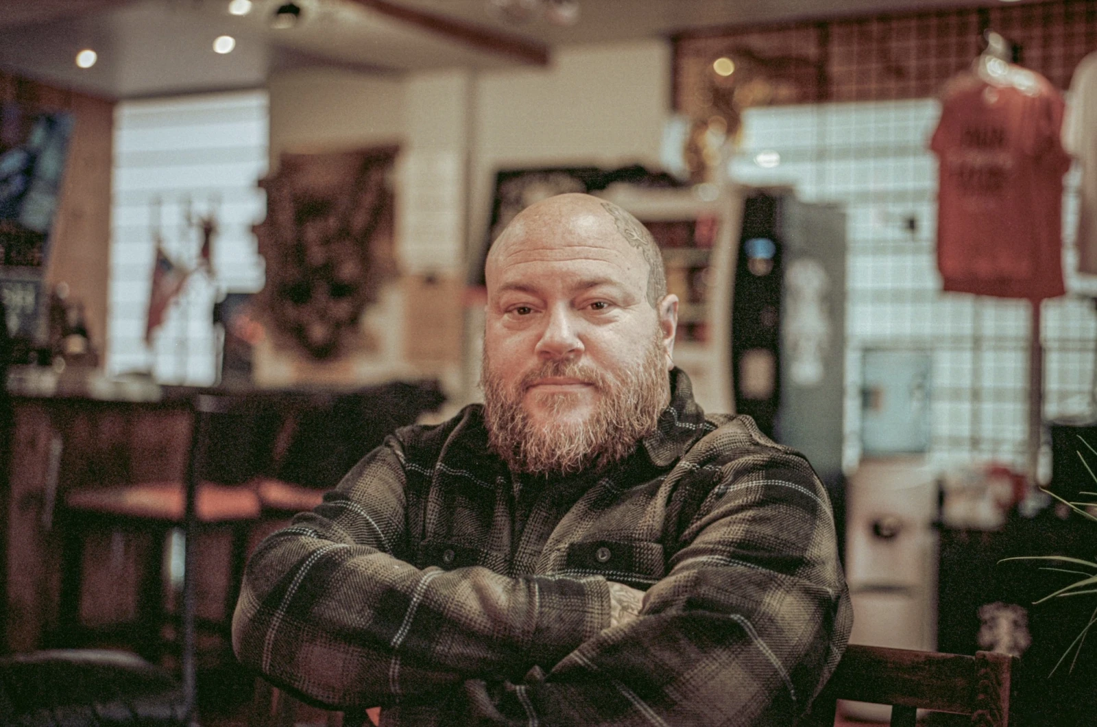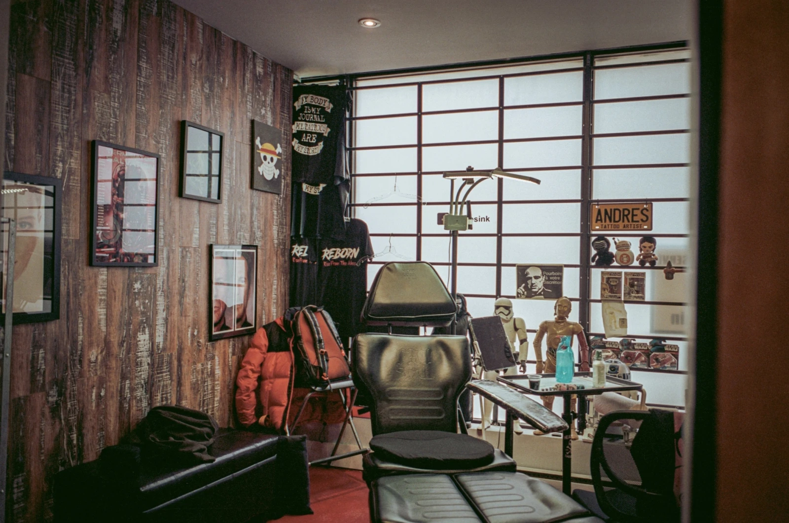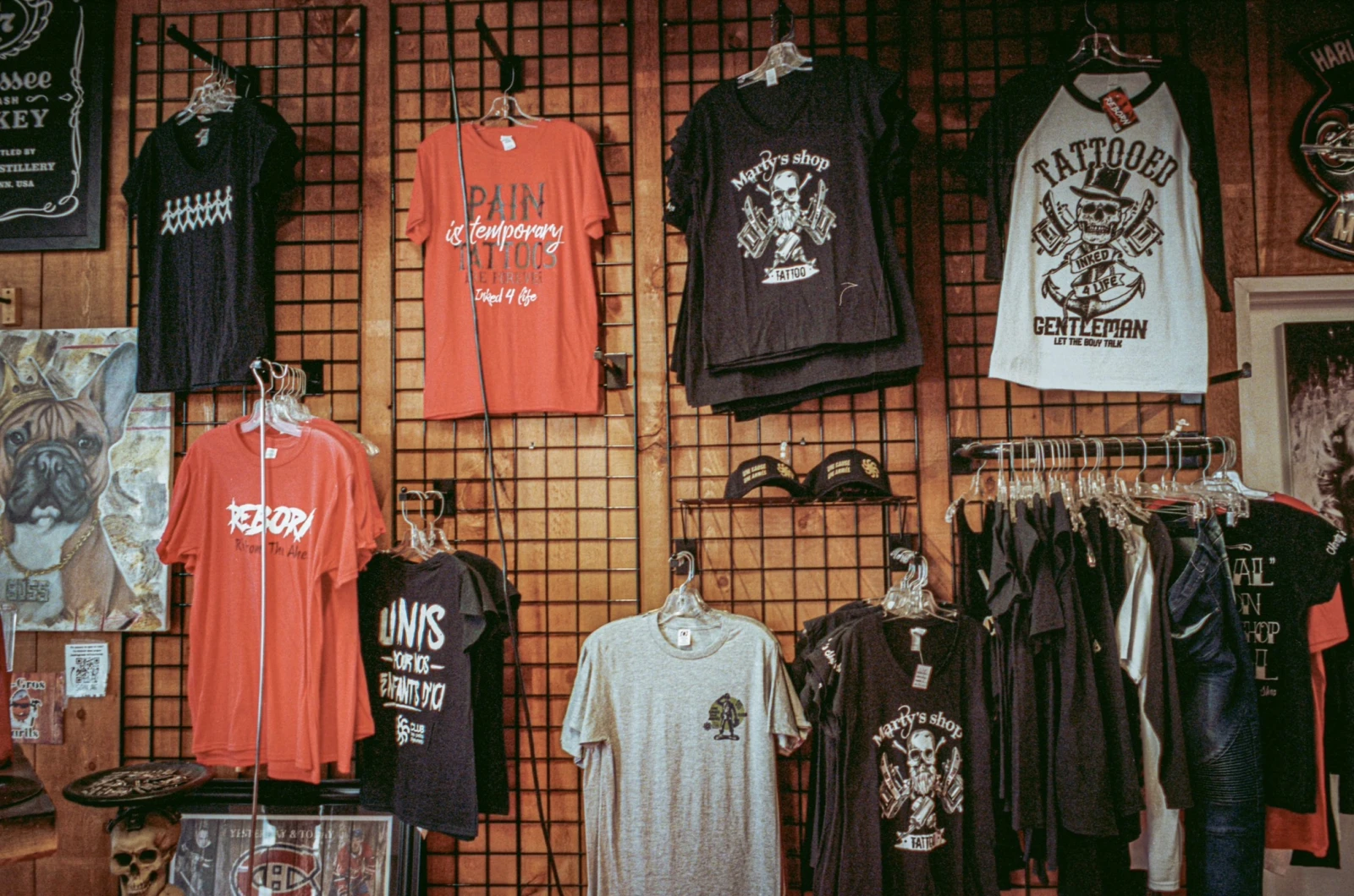 « L’intérieur habituel des tattoo shop est tellement froid, comme une clinique médicale. Je voulais une mancave avec du bois brûlé », affirme-t-il en pointant la décoration abondante qui nous entoure. Il ajoute que la clientèle est souvent étonnée par l’ambiance chaleureuse des lieux. Aux divans en cuir se mêlent une machine à popcorn, un bar à bijoux et une large collection de vêtements de la griffe maison.