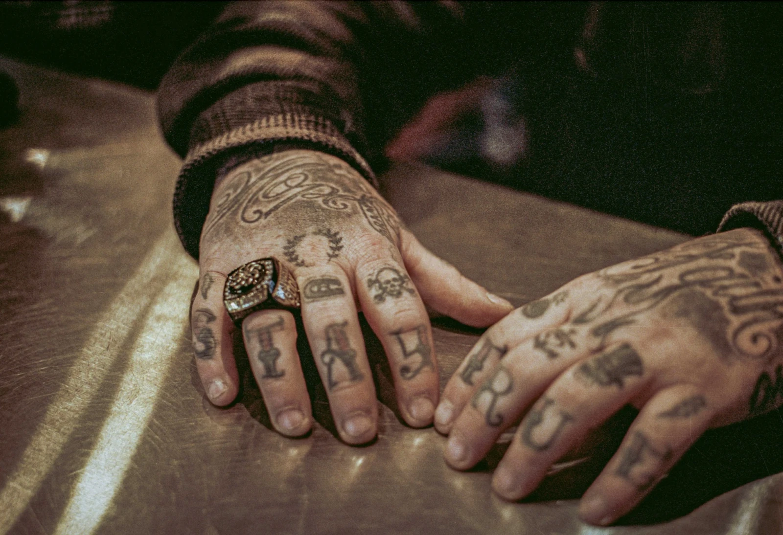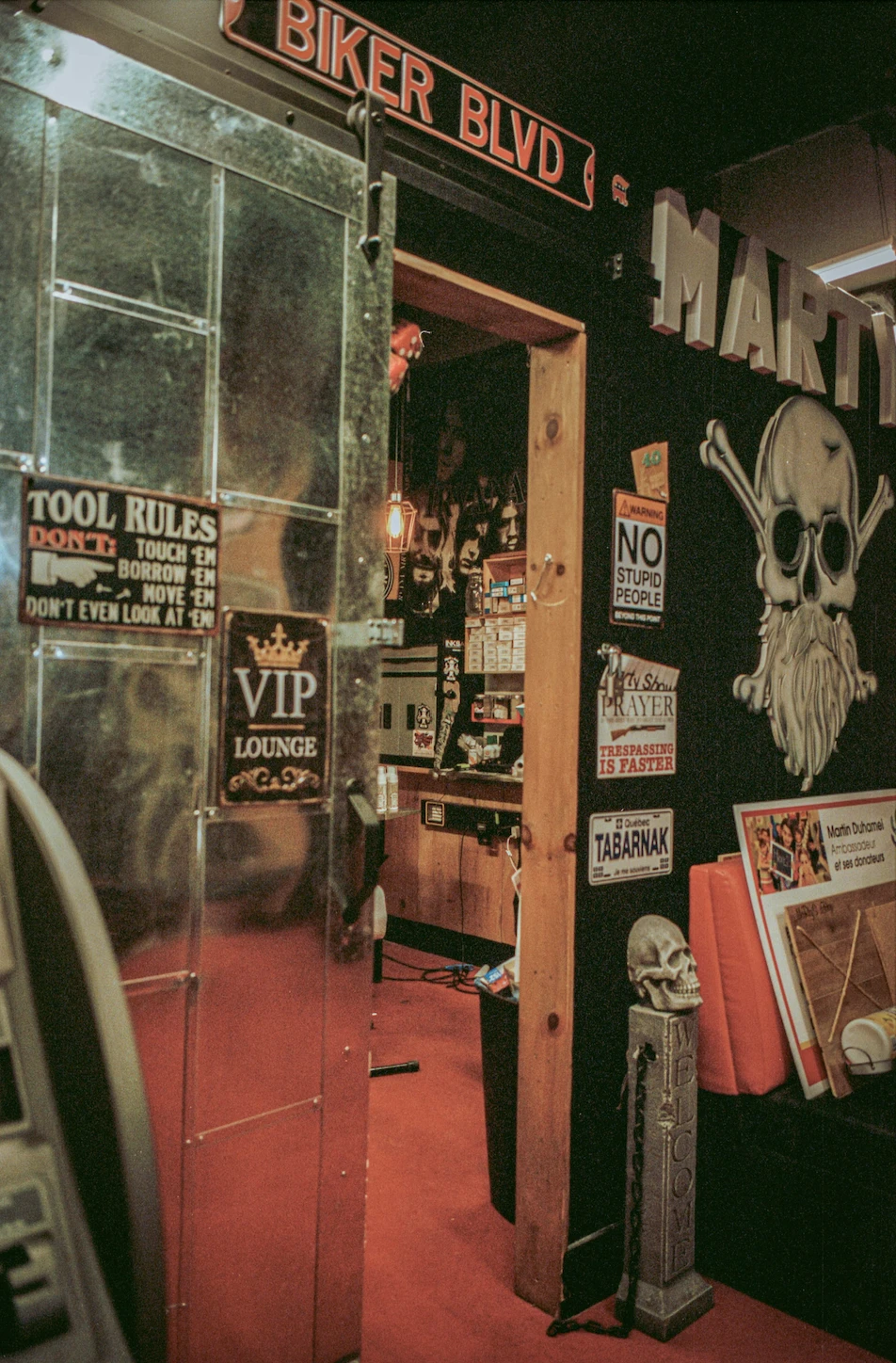 À l’intérieur du grand local – qui, sans surprise, occupe la fonction de studio de tatouage –, on retrouve des enseignes Jack Daniel’s, des portraits de Tony Montana tout comme des autocollants Harley-Davidson, un jukebox vintage et un prie-Dieu de brocante. Un air de tap bar à l’américaine avec ben des têtes de mort où les Stones se fondent dans le bourdonnement des aiguilles.