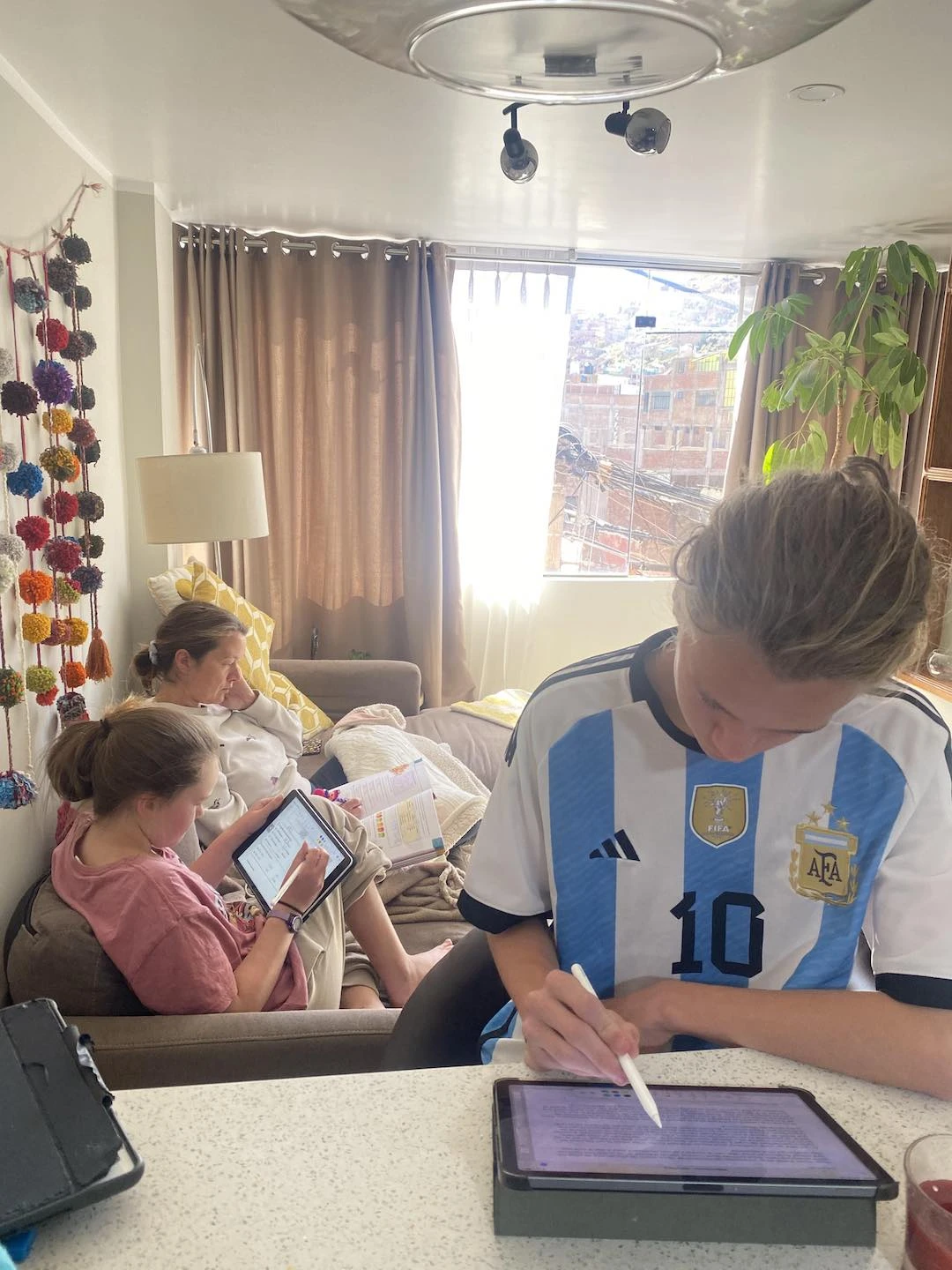 Dans le salon, ma famille boucle l’année scolaire.