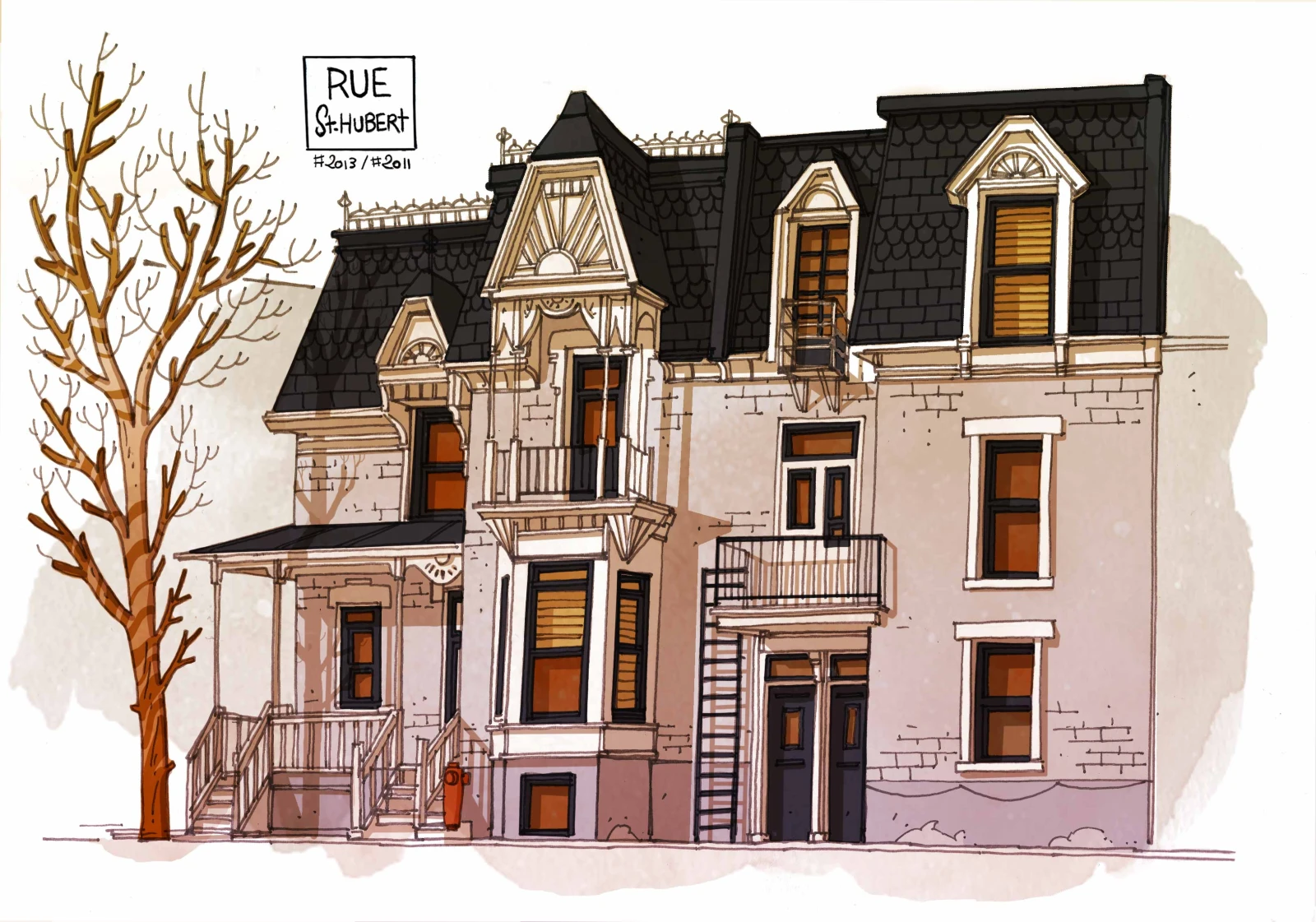Entre la rue Sherbrooke et la rue Ontario sur St-Hubert se trouve toute une série de belles maisons de style victorien. Leurs couleurs originales, leurs ornements architecturaux, le mélange de bois et de pierre en font de très bons sujets de croquis.