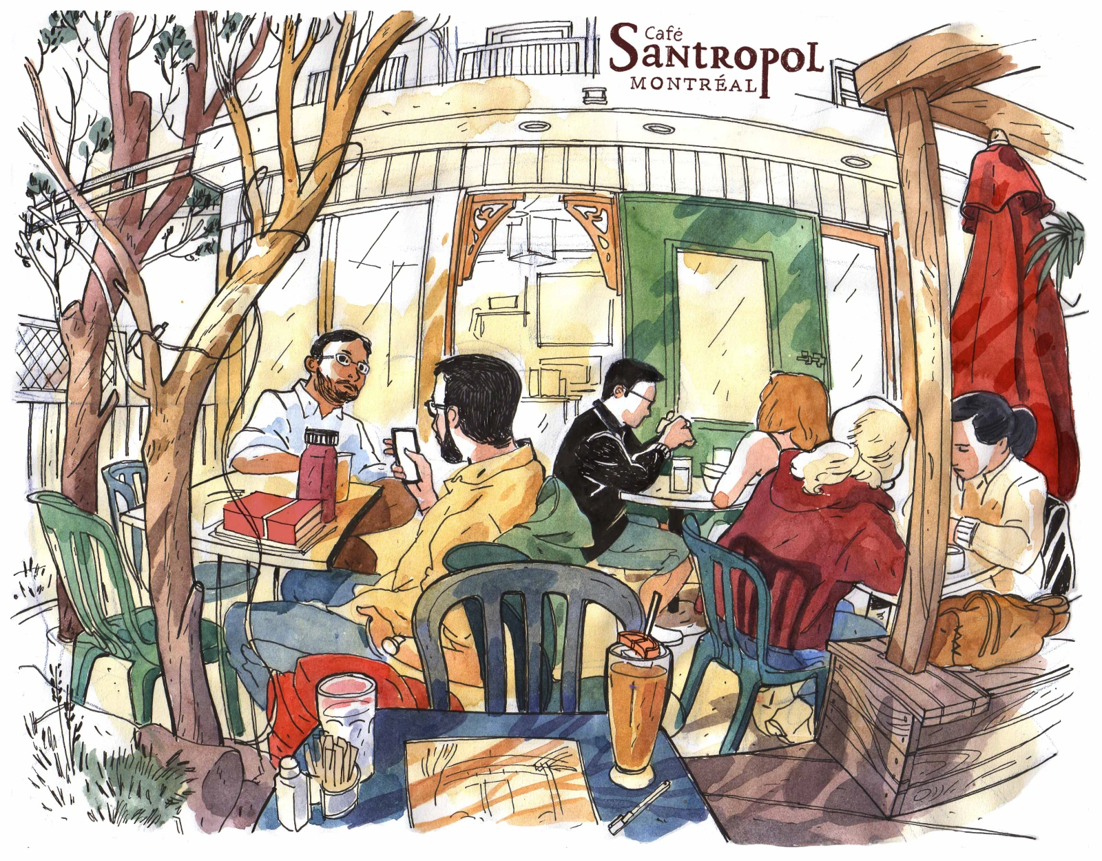 Je passais régulièrement devant la terrasse du café Santropol sans jamais m’y être arrêté. J’ai profité d’une belle journée ensoleillée la semaine dernière pour y boire un thé et faire un p’tit croquis (qui m’a pris un temps fou)!