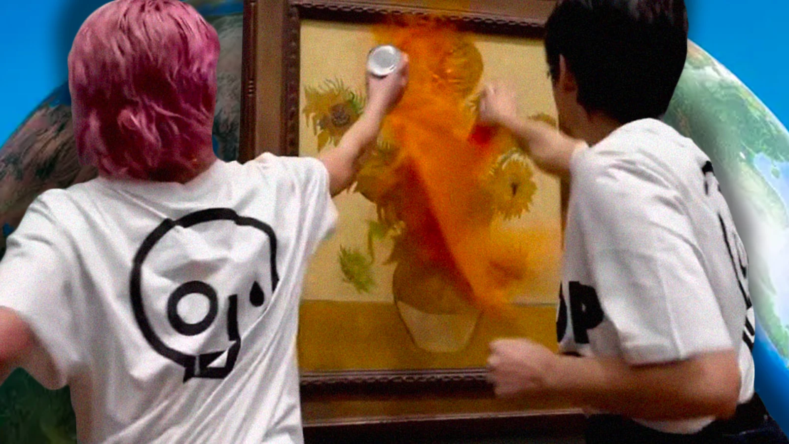 « Qu’est-ce qui vaut plus, l’art ou la vie ? », interroge à voix haute l’activiste britannique Phoebe Plummer, à genoux dans la Galerie nationale de Londres. Elle vient d’asperger de soupe à la tomate la mythique peinture Les tournesols de Vincent Van Gogh à l’aide de sa collègue de Just For Oil, un collectif militant pour le climat via des actes non violents de résistance civile.