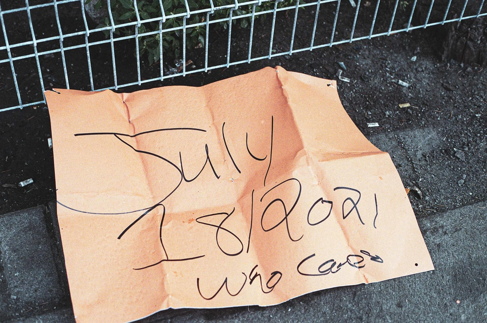 Miali m’explique la signification de son tatouage traditionnel, le skin-stiched ancestral qu’elle arbore au visage, considéré comme un art divin. Célébration de son héritage, elle me confie qu’elle en a parfois honte. Il est pourtant magnifique. Dur destin que celui des Inuits déracinés. À une époque éclaboussée par le drame des pensionnats, la seconde grille, aussi concrète que symbolique, ne fait qu’élargir l’océan qui nous sépare et entache tout processus de réconciliation souhaité. Une affiche au sol résume avec désolation l’envergure du clivage : July18/2021, Who cares.