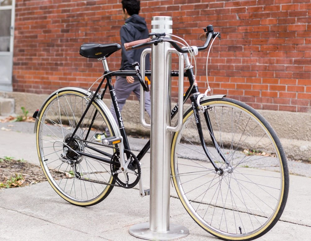 « L’avantage du poteau, c’est qu’il est facile à implanter sur n’importe quel trottoir. Il cause peu d’encombrement. C’est un moyen flexible, mais il ne rajoute pas une grande capacité de stationnement, parce que chaque poteau ne peut accueillir que deux vélos. »