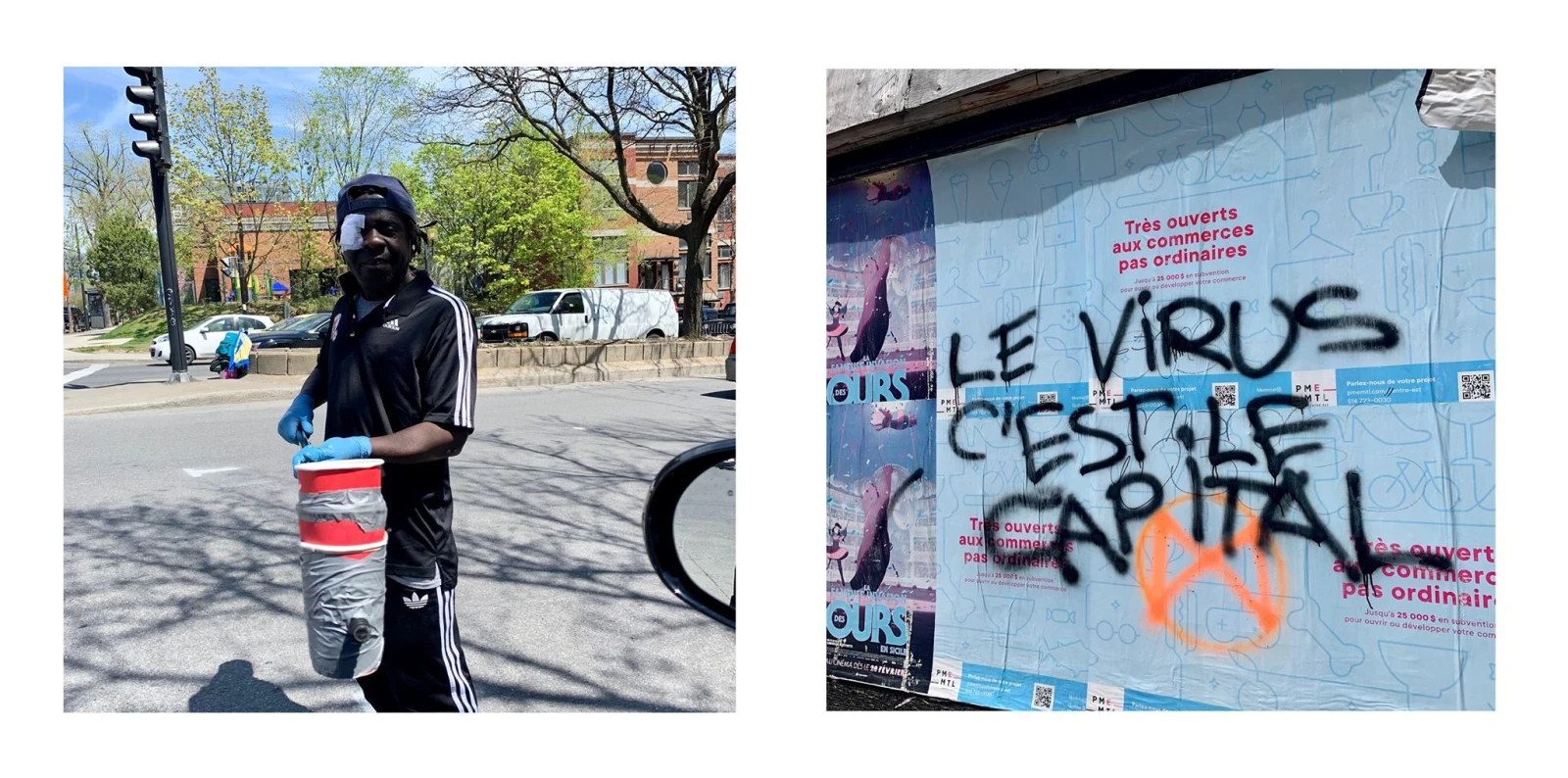 À travers ce climat d’inquiétante étrangeté, j’ai redécouvert ma ville. En fait, j’ai découvert ma ville, parce qu’elle n’a jamais rayonné autant de ses différences, ses paradoxes et ses inégalités. Et puis, quelque chose avait changé dans le paysage urbain. Avec ses commerces fermés, ses murs plus que jamais dévorés par les graffitis, ses rues difformes couvertes de cannettes et de gravier hivernal, force est d’admettre que Montréal s’était salie, ce qui lui donnait les charmes punk rock d’une époque que nous n’avons pas connue. Tiens, un itinérant tombe en essayant de voler un vélo fantôme.