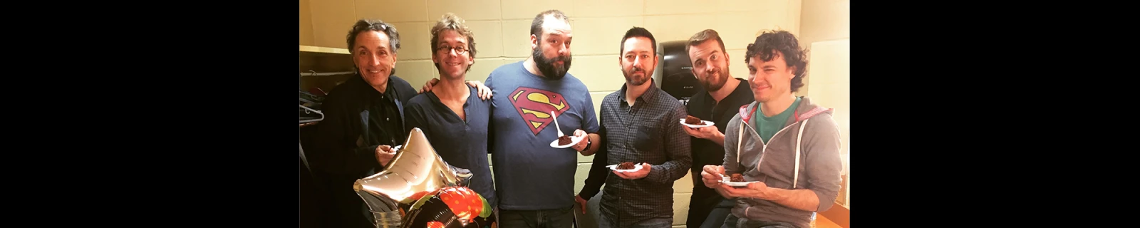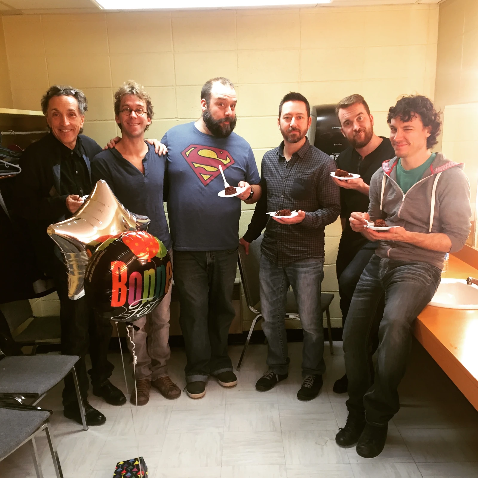 L’après-spectacle de Fredericton vira pas mal wild et je m’apprête à briser une règle stricte du rock’n’roll. Ce qui se passe dans les loges ne restera pas dans les loges, mais sera étalé au grand jour ici. Groupies? Drogues dures? Non. Gâteau au chocolat. C’était la fête de Fred, ils ont mangé du gâteau. Paraît même qu’il était pas mal fort en chocolat, du genre que c’est pas tout le monde qui aurait été game d’y goûter.