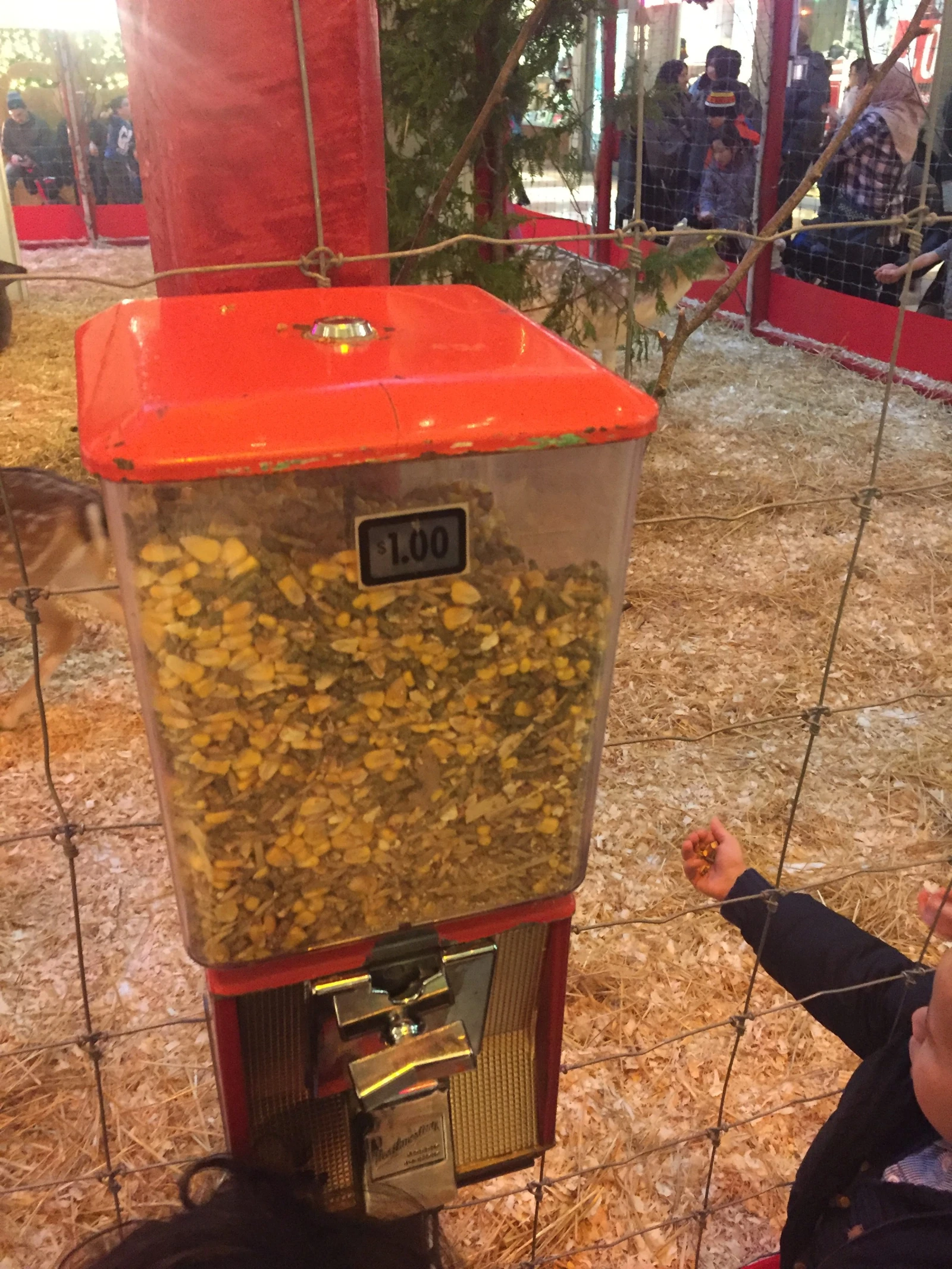 Derrière l’enclos, l’arbre de Noël est l’endroit tout désigné pour s’asseoir quelques minutes pour checker son téléphone le temps que son enfant se tanne de donner de la moulée à des cervidés.