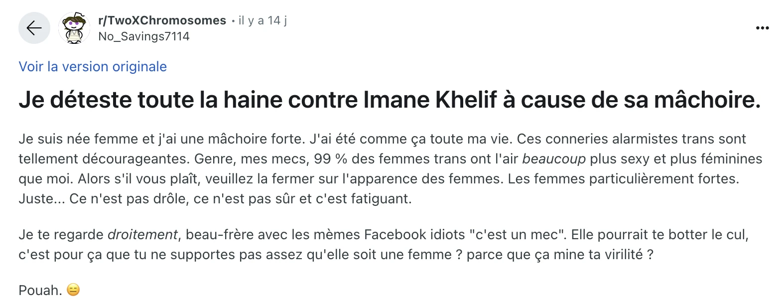 « Cette polémique, avec Imane Khelif qui est une femme cisgenre, est teintée de transphobie puisque c’est une rhétorique d’arguments transphobes et réactionnaires qui sont utilisés contre l’athlète », distingue Capucine.