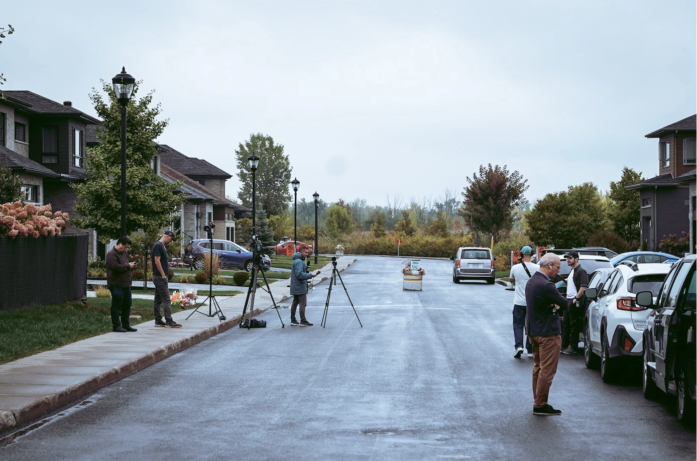 Un camion de livraison s’arrête, crache son colis, repart aussitôt, comme si rien ne devait déranger le ballet tranquille du quotidien. Et puis, au coin de la rue Joseph-Daigneault, l’accroc dans la toile. Un bouquet de fleurs, quelques bougies fanées. Devant, des trépieds s’ouvrent d’un son métallique qui déchire le calme trop parfait du décor.