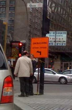 2- Le Général Moteur a décidé de soudoyer les travaux publics de la Ville de Montréal en érigeant un détour vers leur édifice. (Au coin de Guy – Maisonneuve)