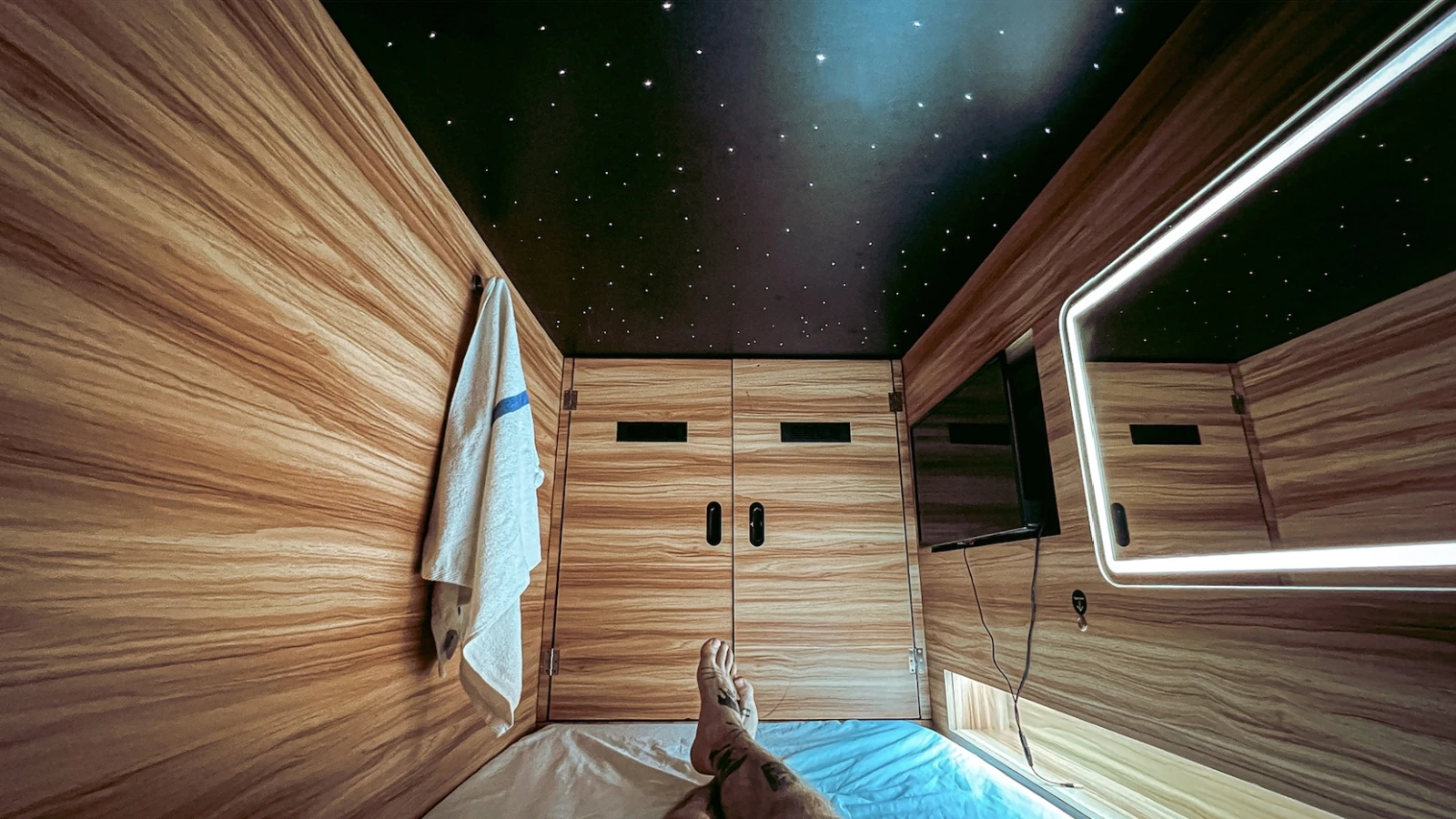 À 40 piastres la nuit, je ne m’attendais pas au Ritz non plus. La capsule accueille sans problème mes six pieds. Allongé, mes doigts effleurent le plafond. L’espace respire. Étonnamment, on s’y sent bien, malgré qu’il ferait suffoquer le moindre claustrophobe.