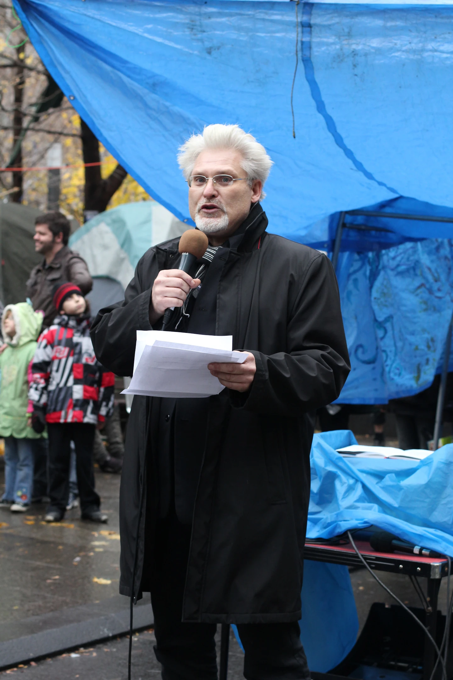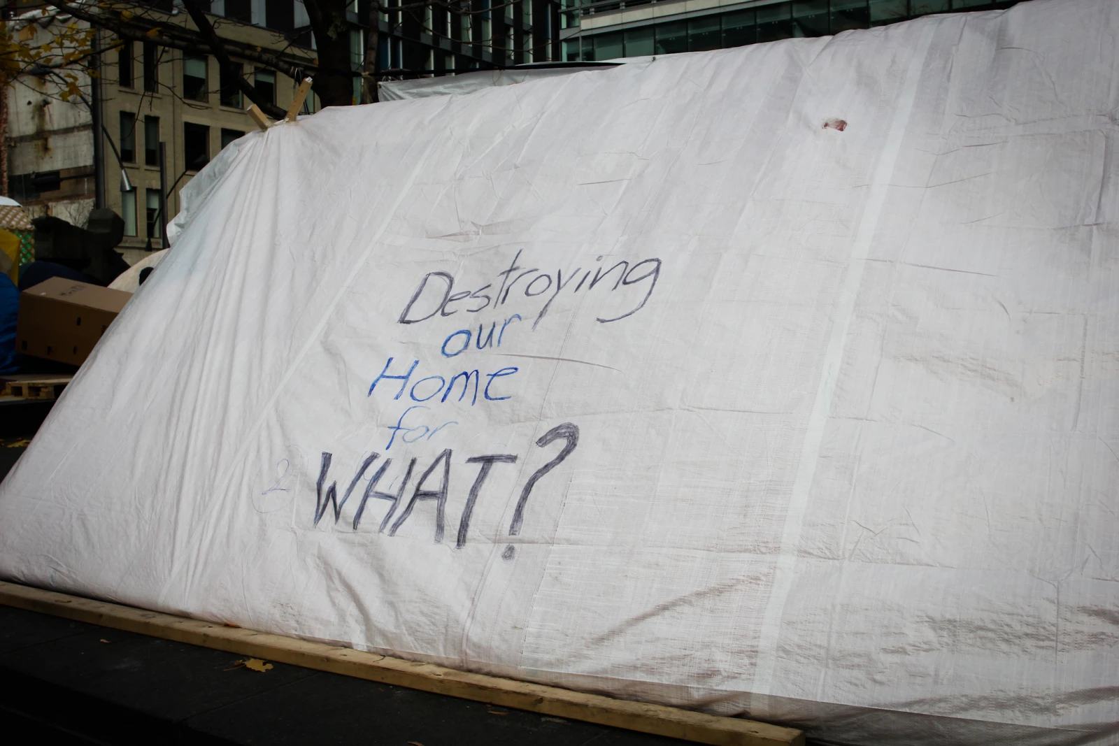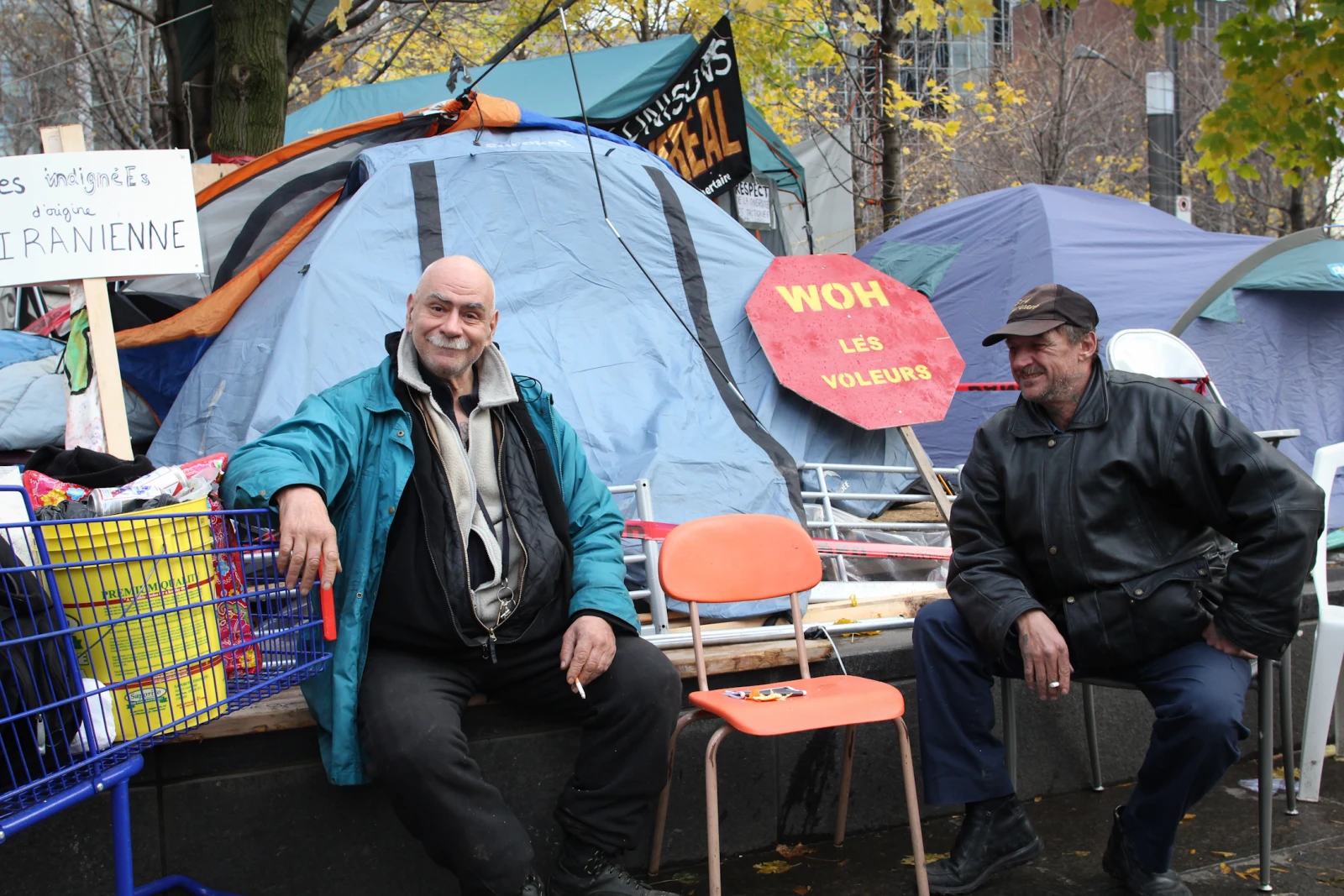 Mi-novembre, des occupants démontent leurs habitations de bois. D’autres attendent le passage des cols bleus. Des écrivains manifestent leur appui pendant que des tentes militaires sont montées. Les premiers organisateurs annoncent qu’ils concentreront leurs énergies ailleurs. Le camp change.